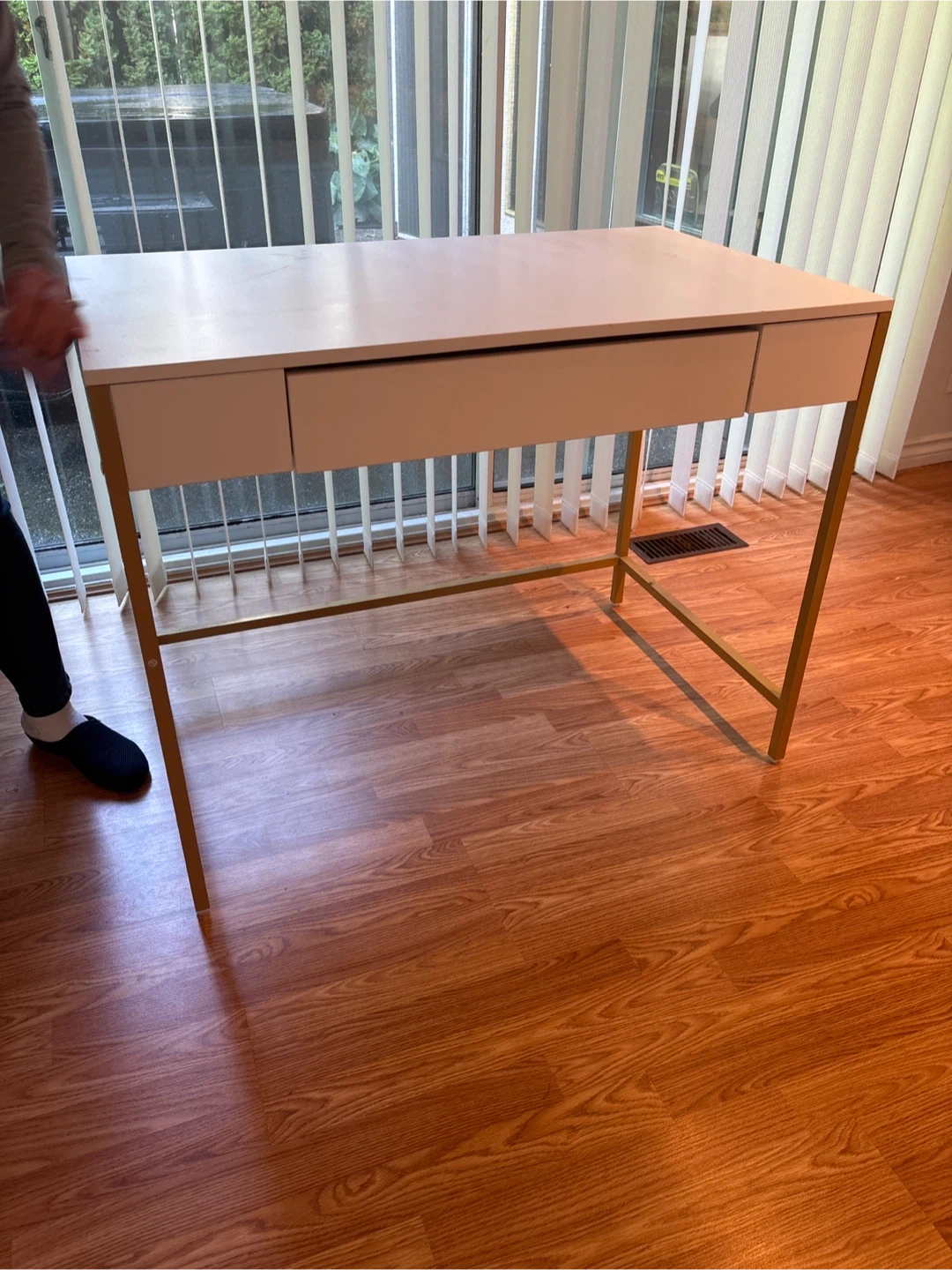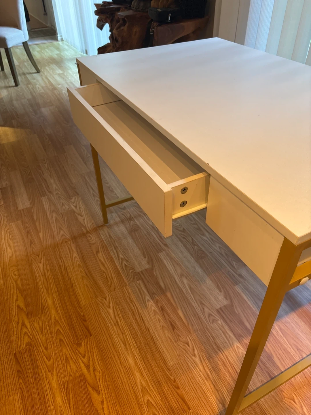 Selling a stylish desk with a white top and gold-colored frame. It has a clean and modern look, perfect for a home office or study space. Features a handy drawer for storage. In great condition!