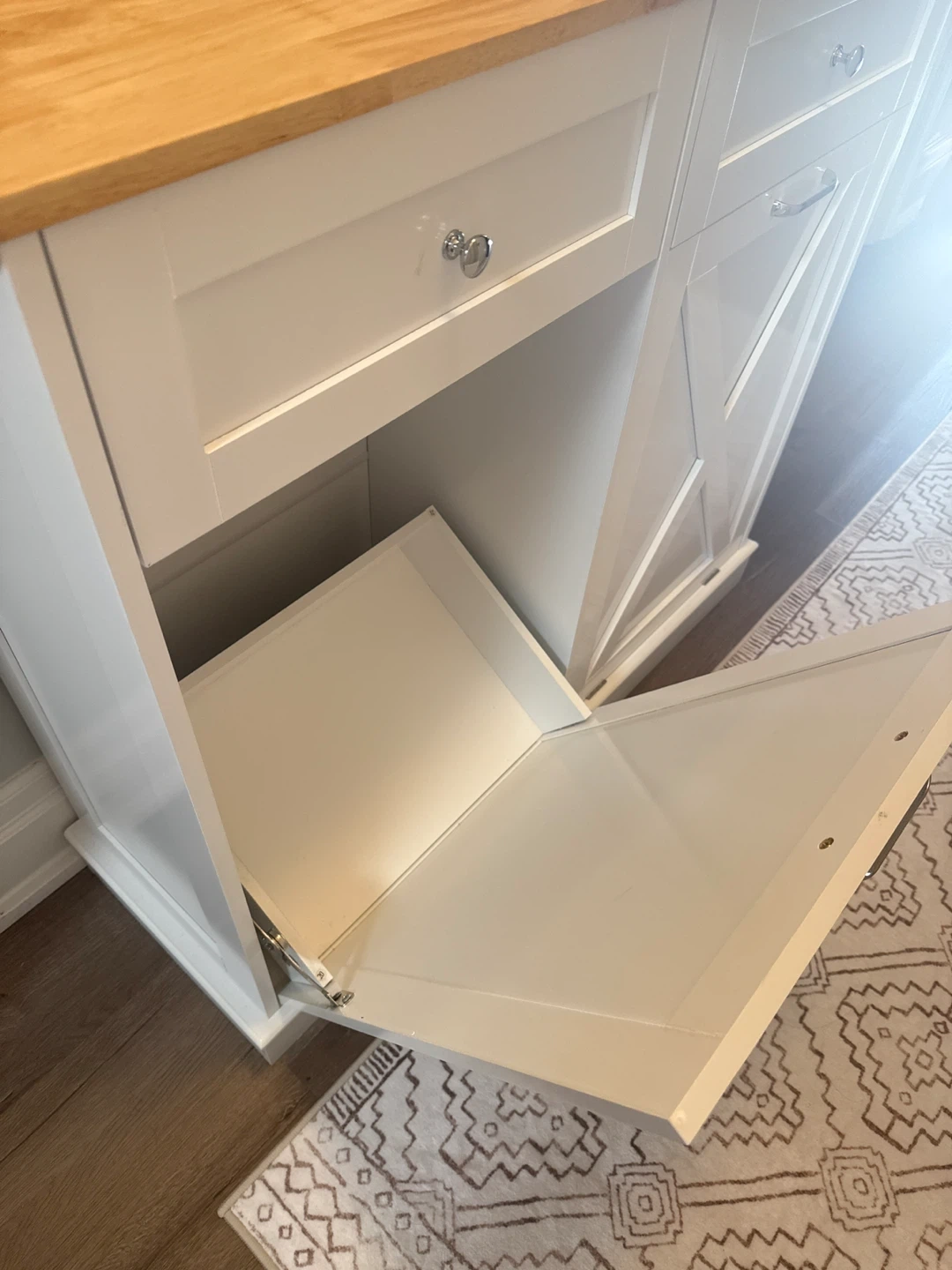36Laundry or garbage bin storage with 2 drawers for storage on top. White and wood top. Eye catcher perfect for someone who likes organizing. Downsizing and hope to see it find a new home!!