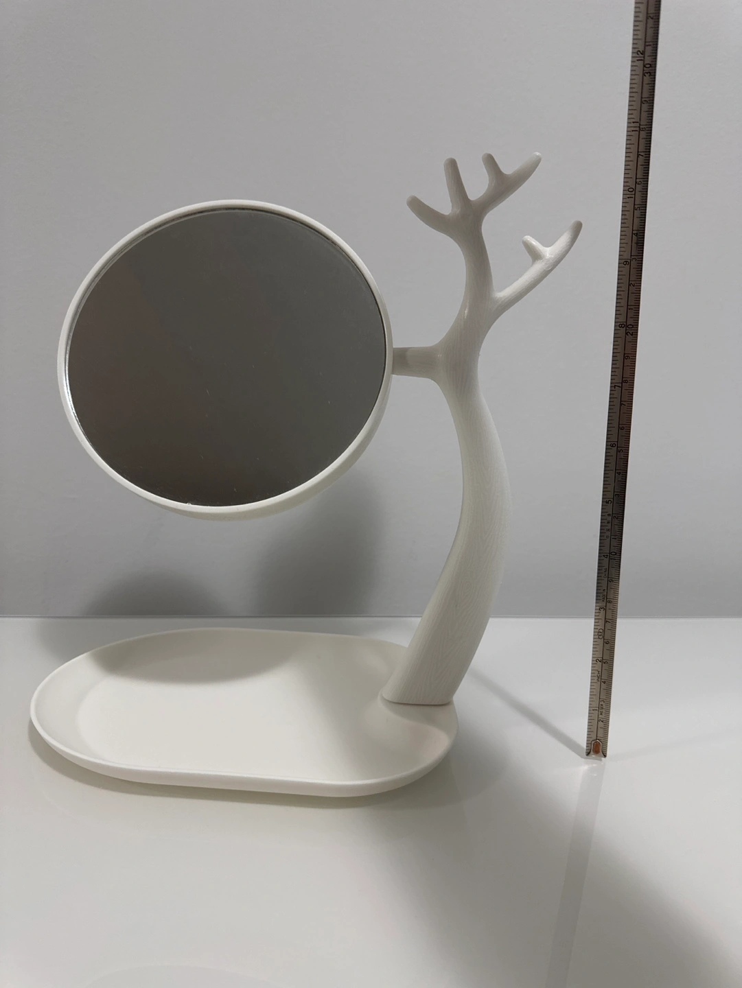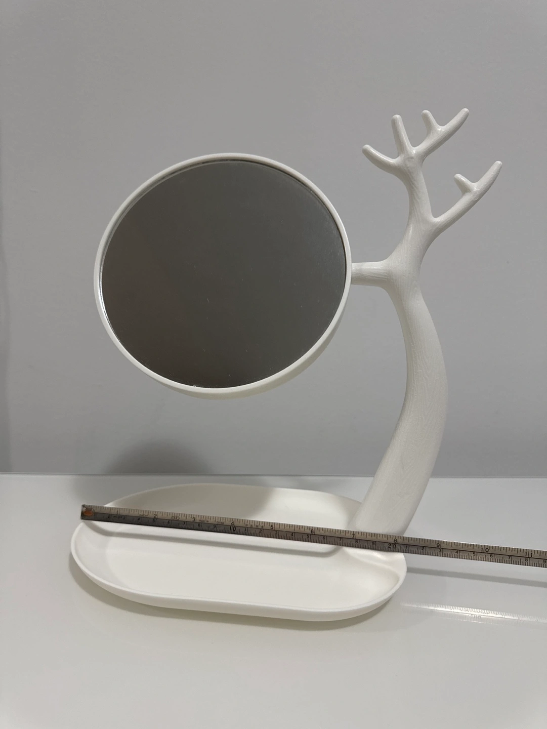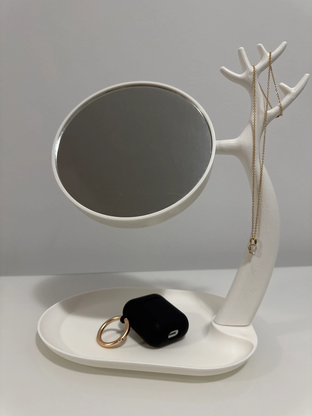 117Cute and functional table top mirror and jewellery organizer. Features a double mirror - one normal and one magnified. The double sided mirror can swivel 360 degrees. 4 in one - tray for earrings, antler for handing necklaces and bracelets, one normal mirror, one magnified mirror. Perfect for vanities or dressers. White plastic. Does not come with the necklace/airpod case in picture!