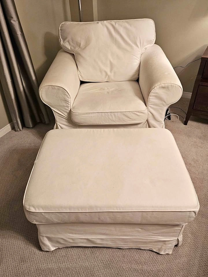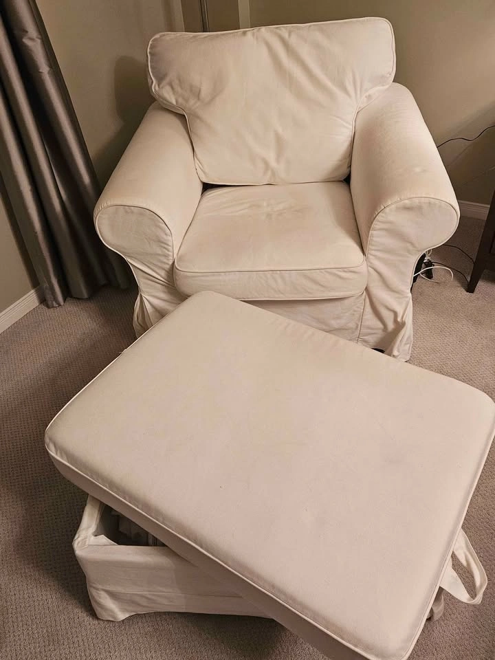 19Selling a comfy white Ikea Ektorpe armchair with a matching ottoman! The ottoman has storage space. It's perfect for creating a cozy reading nook or just relaxing after a long day. There are some signs of use, but it's still in good condition and ready for a new home. The covers are removable for washing and a second cover set is included. Chair is 33" x 40", ottoman is 32" x 24".