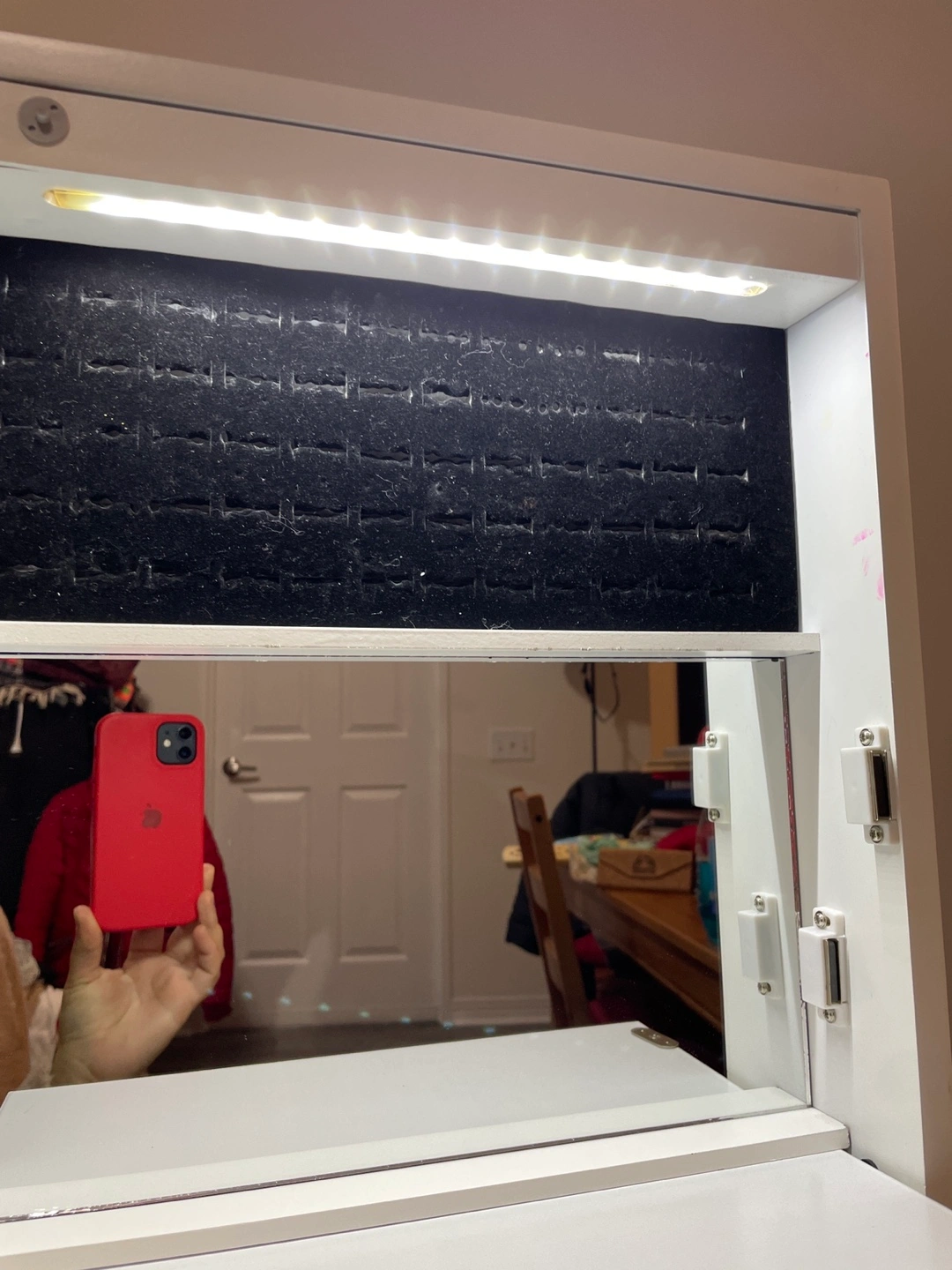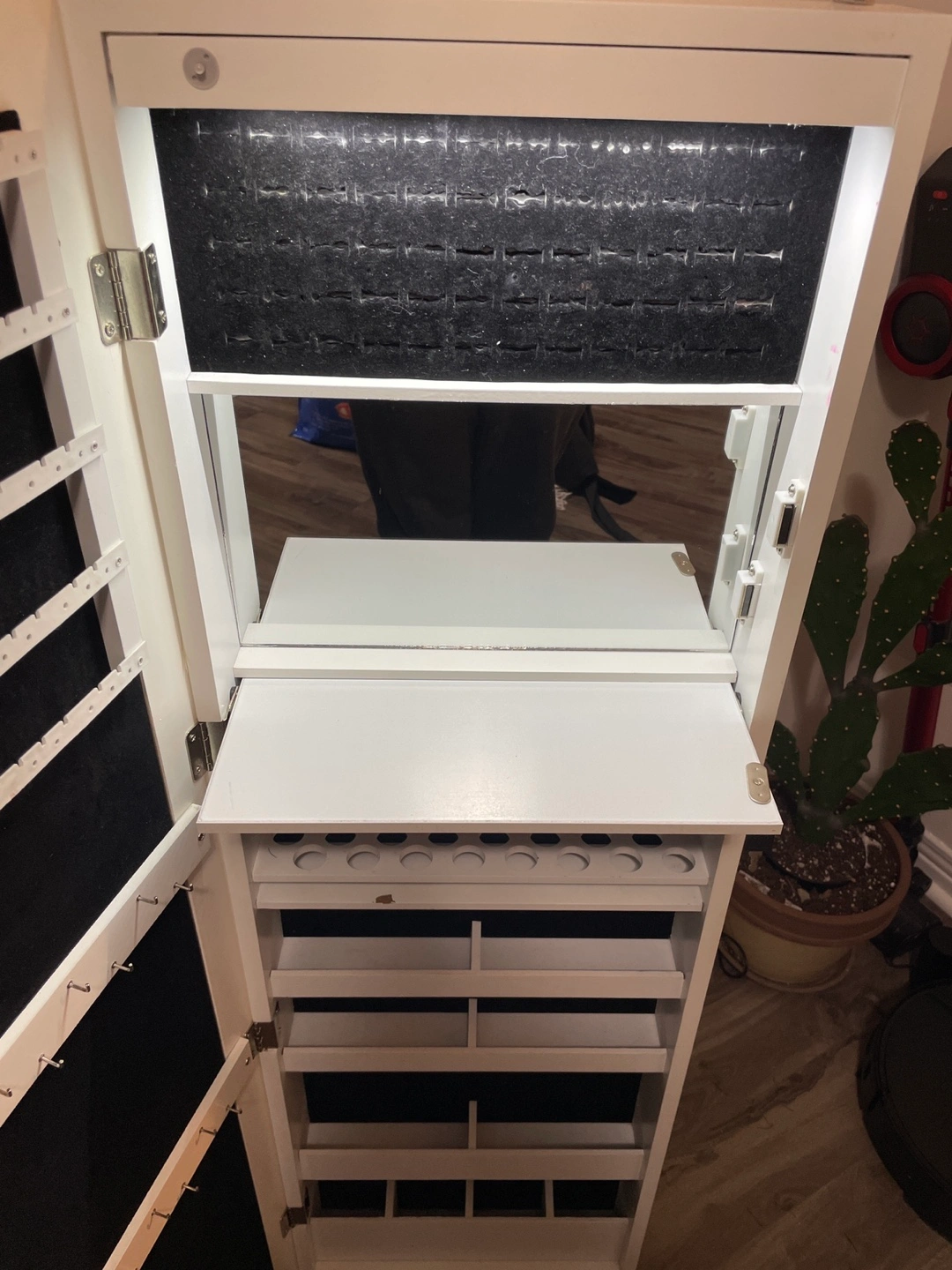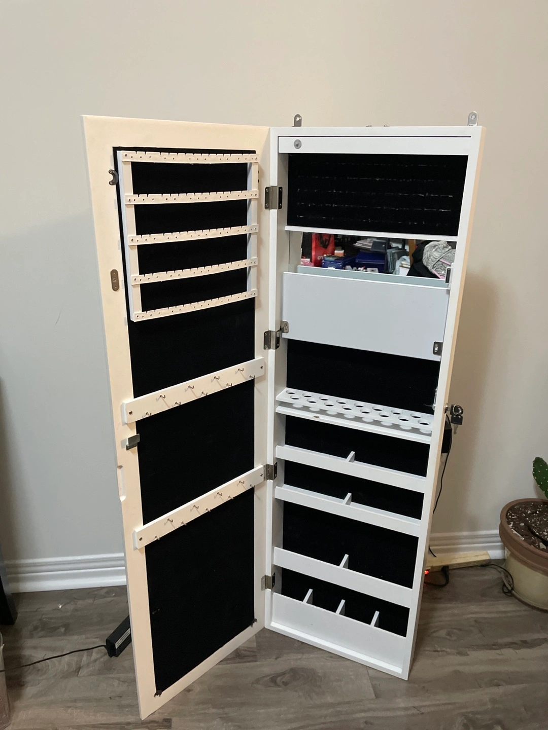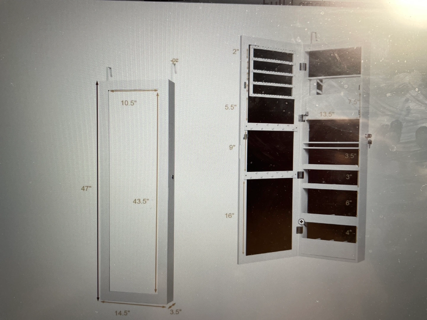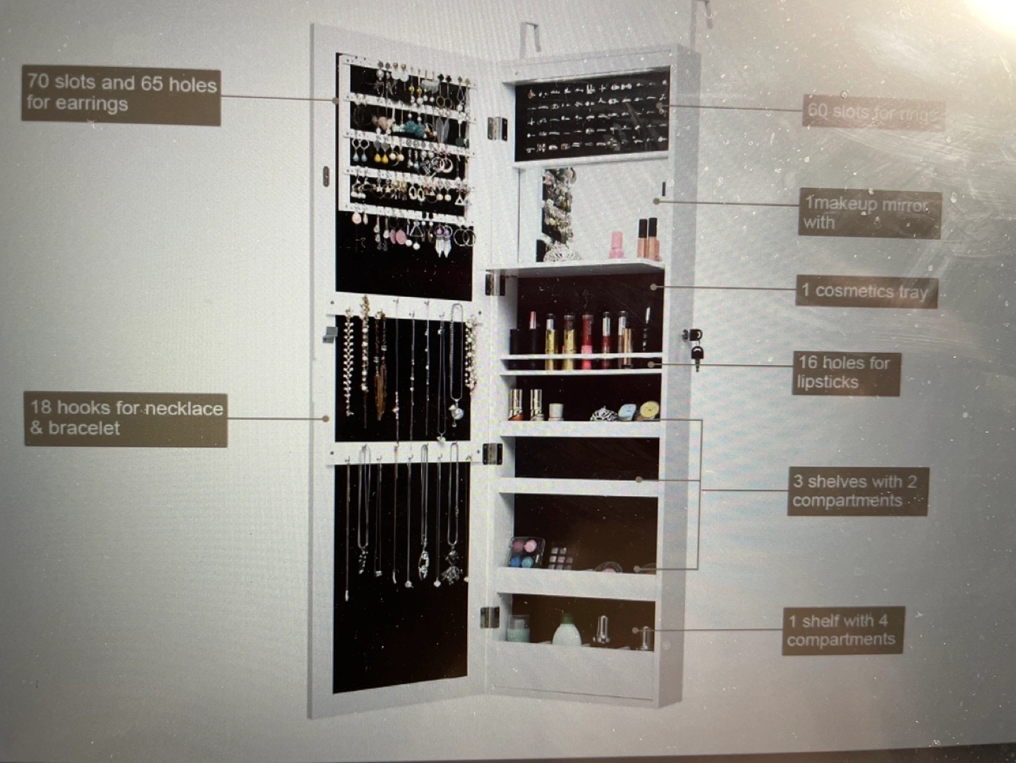 534Full-length mirror, LED lighting, multiple storage compartments, earring slots, necklace hooks, and ring rolls. Great for organizing jewelry and accessories. White finish.