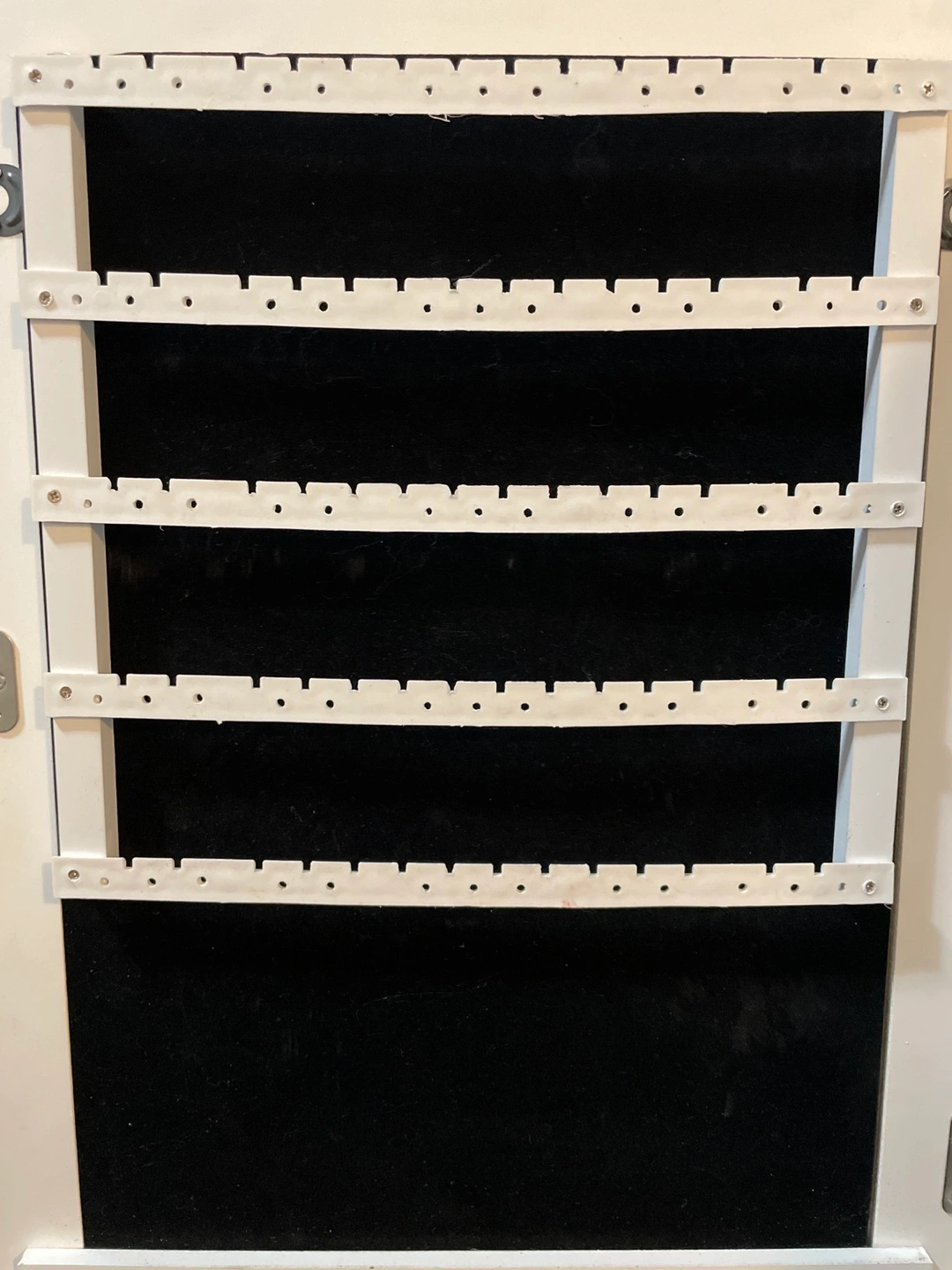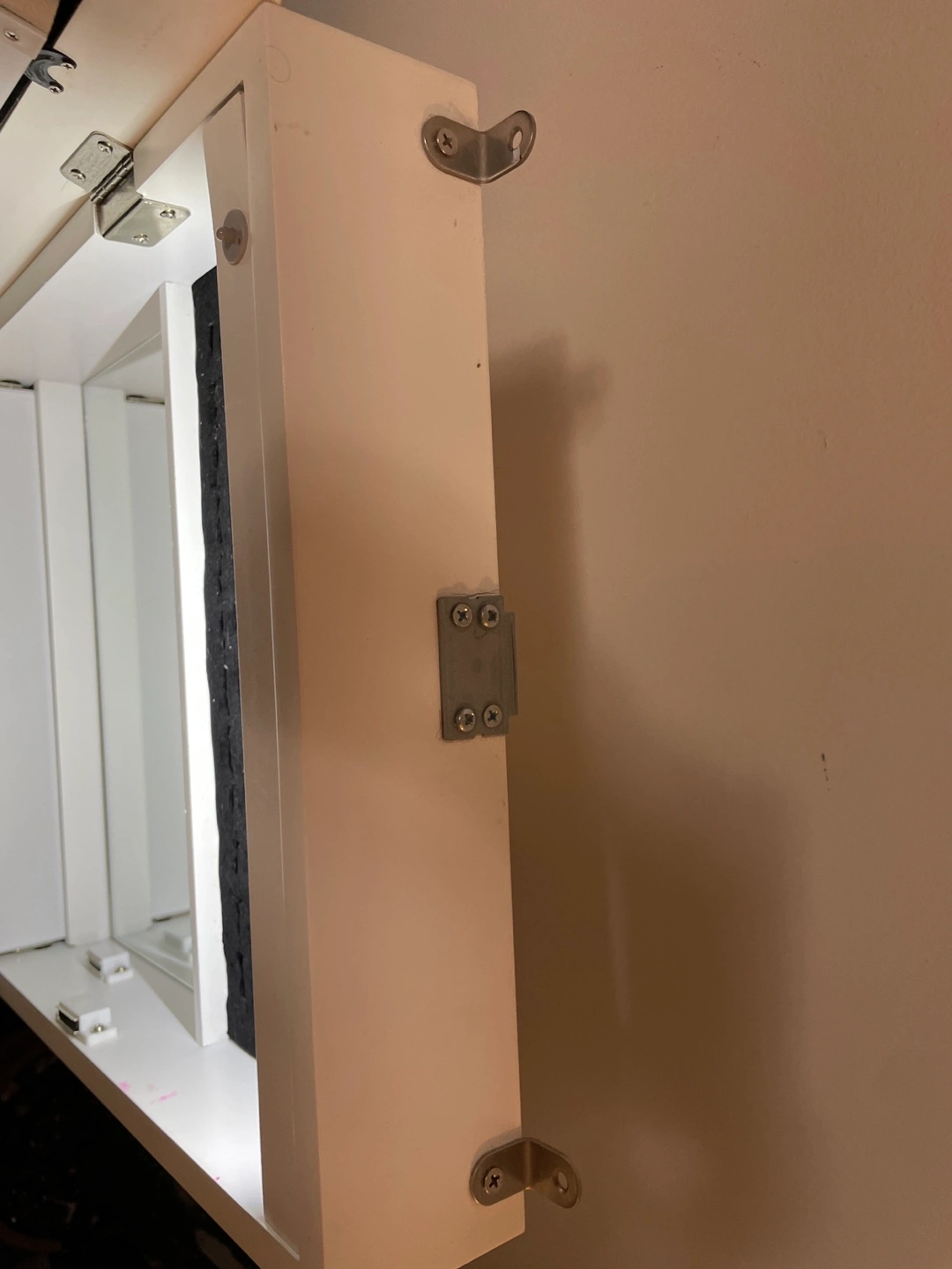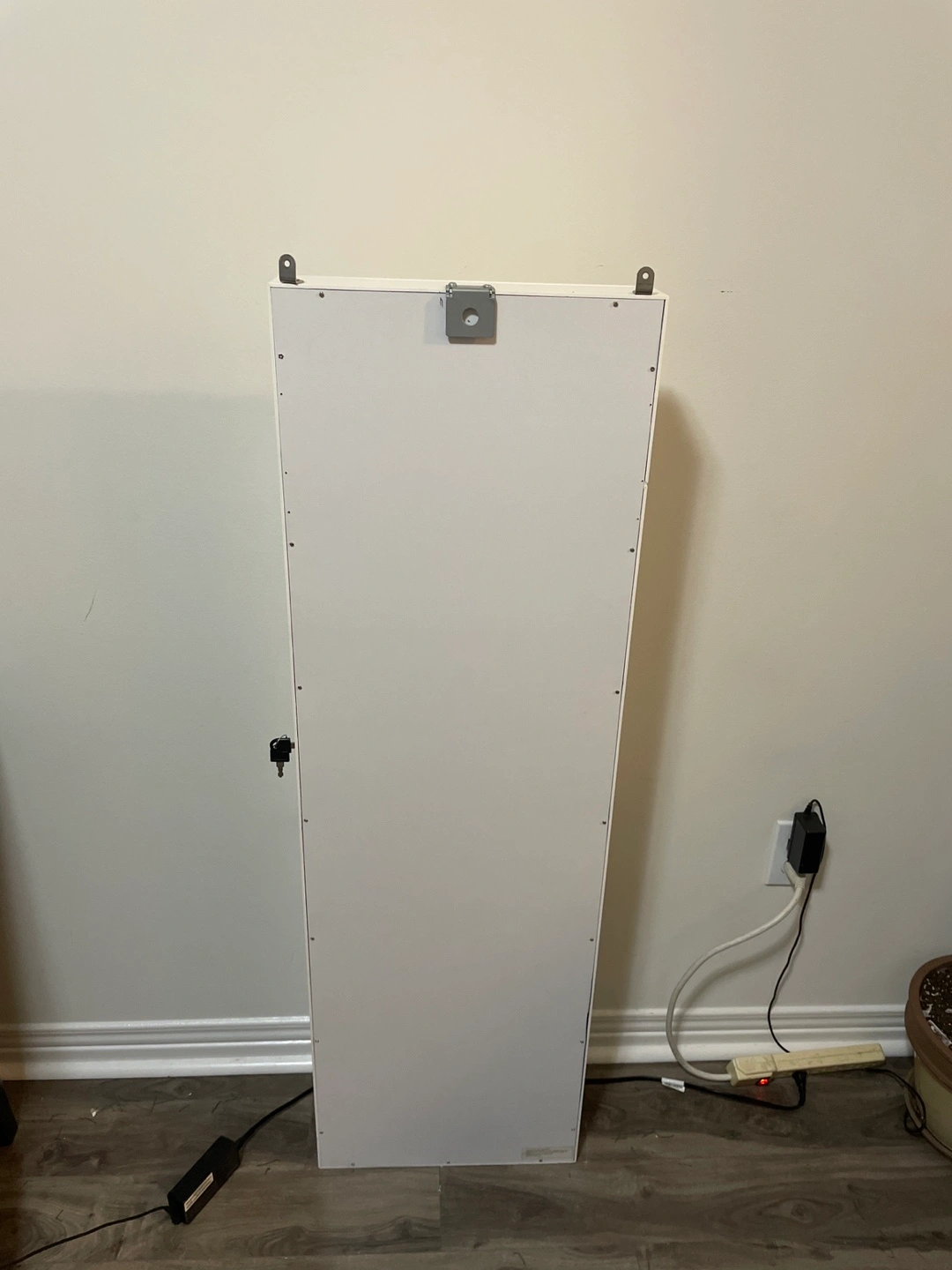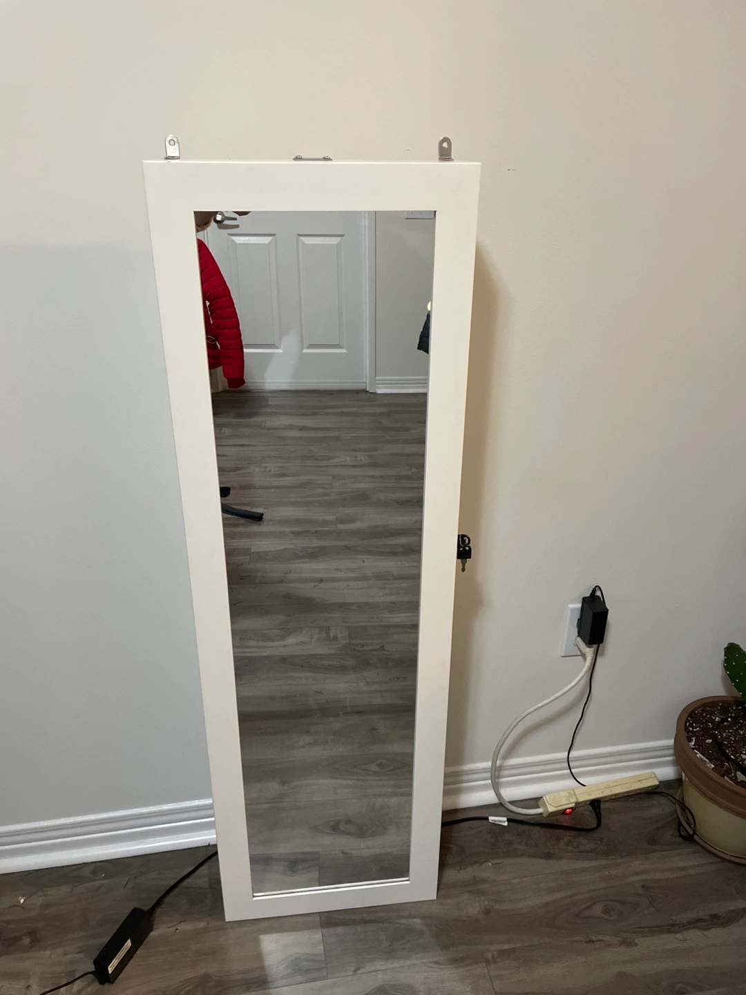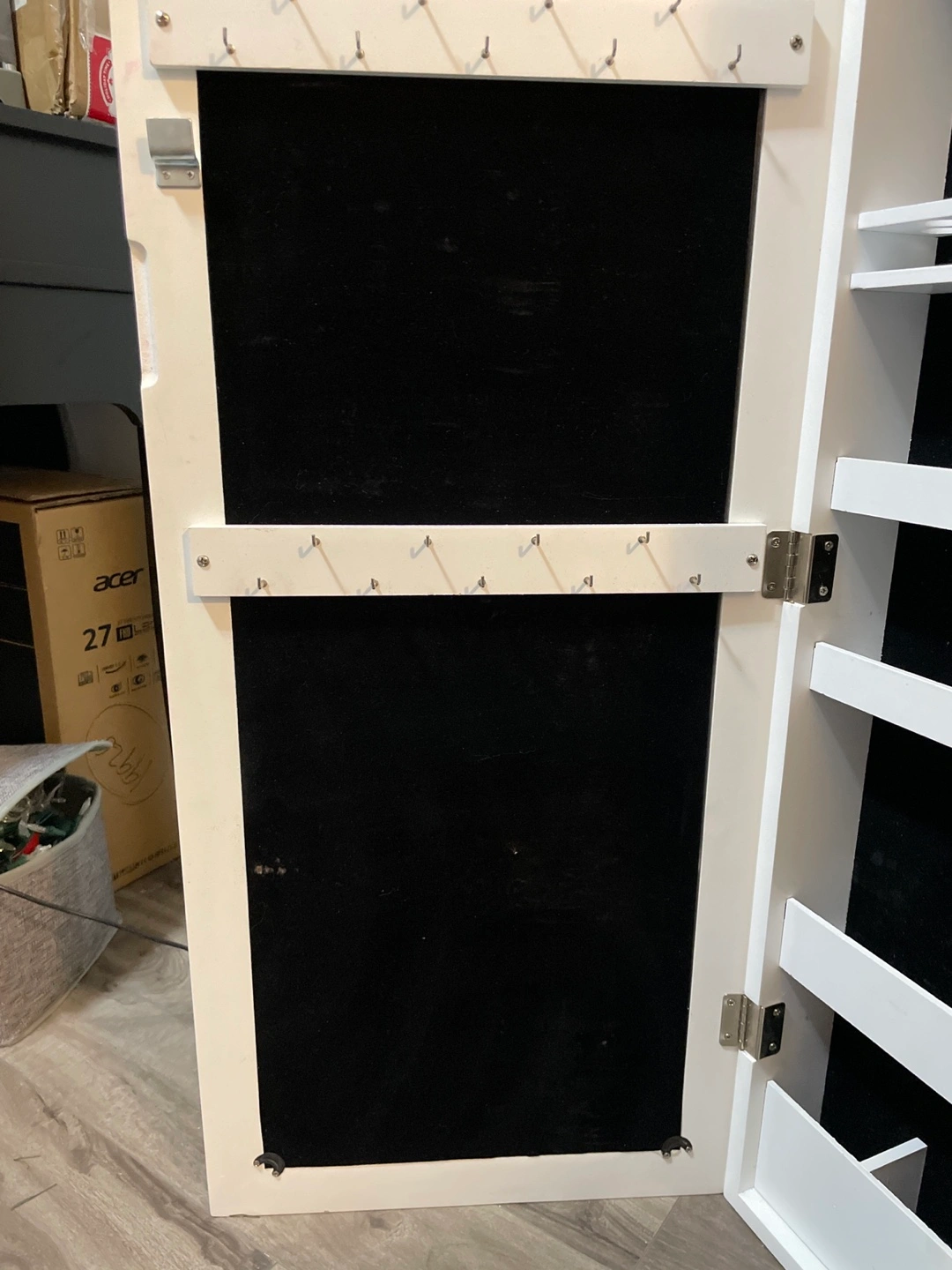 534Full-length mirror, LED lighting, multiple storage compartments, earring slots, necklace hooks, and ring rolls. Great for organizing jewelry and accessories. White finish.