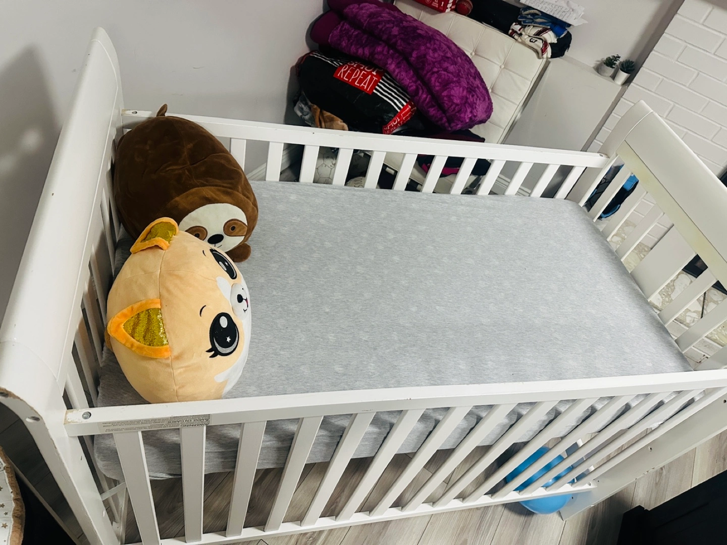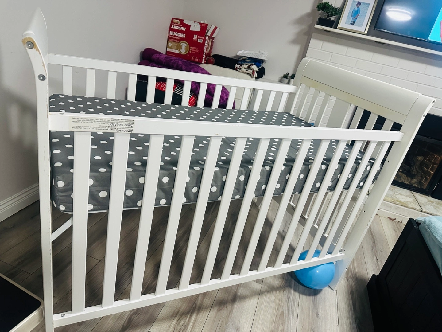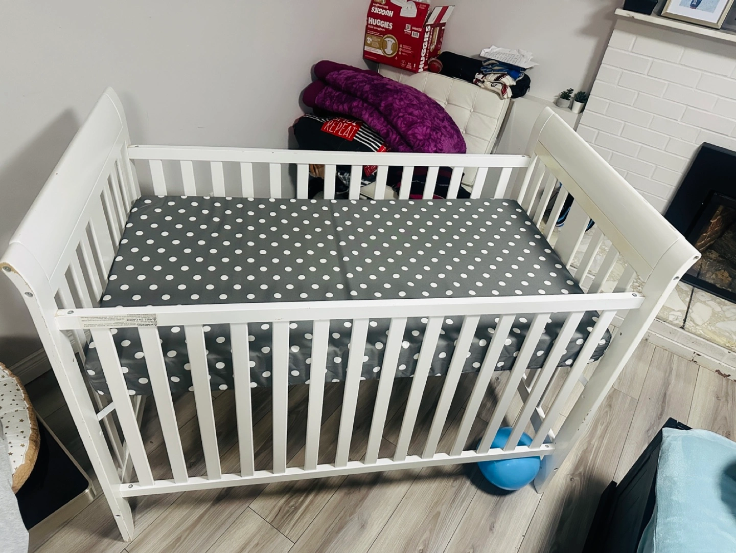10White wooden crib. Good condition. Includes mattress. Simple design. Perfect for a nursery.