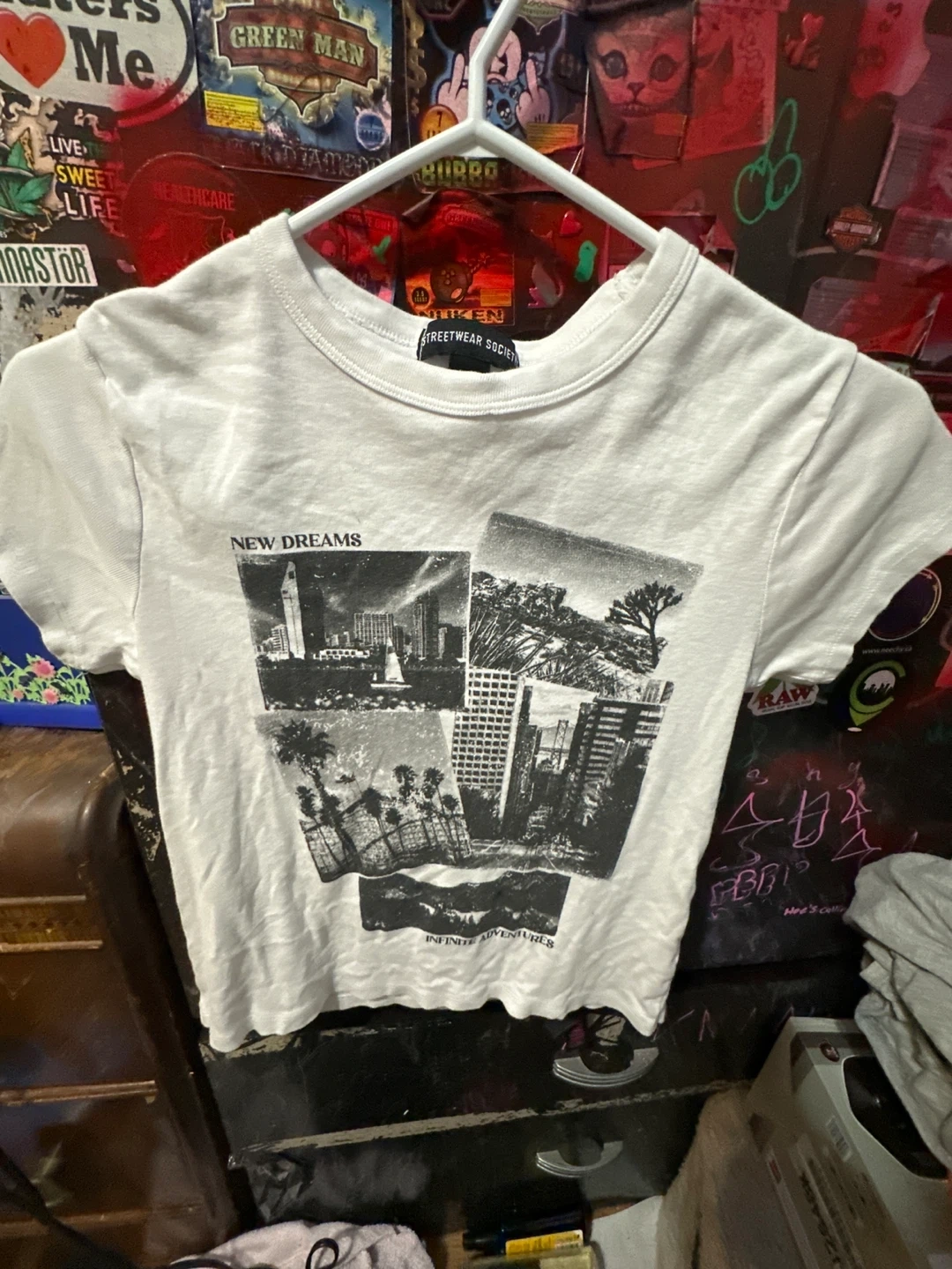 10Selling a cute Streetwear Society graphic tee! The shirt features a collage of black and white images with the words 'New Dreams' and 'Infinite Adventures' printed on it. It's in great condition and ready for a new home!