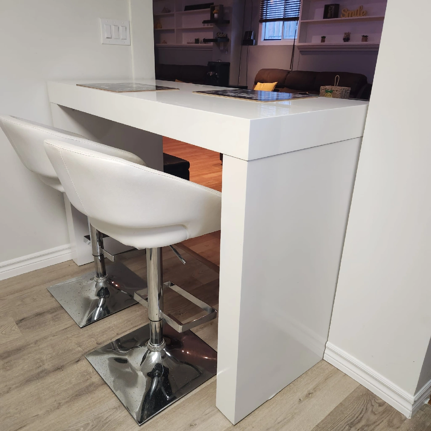 Selling a stylish white bar table complete with two matching stools. This set is perfect for adding a modern touch to your kitchen or dining area. It's in great condition and ready for a new home!