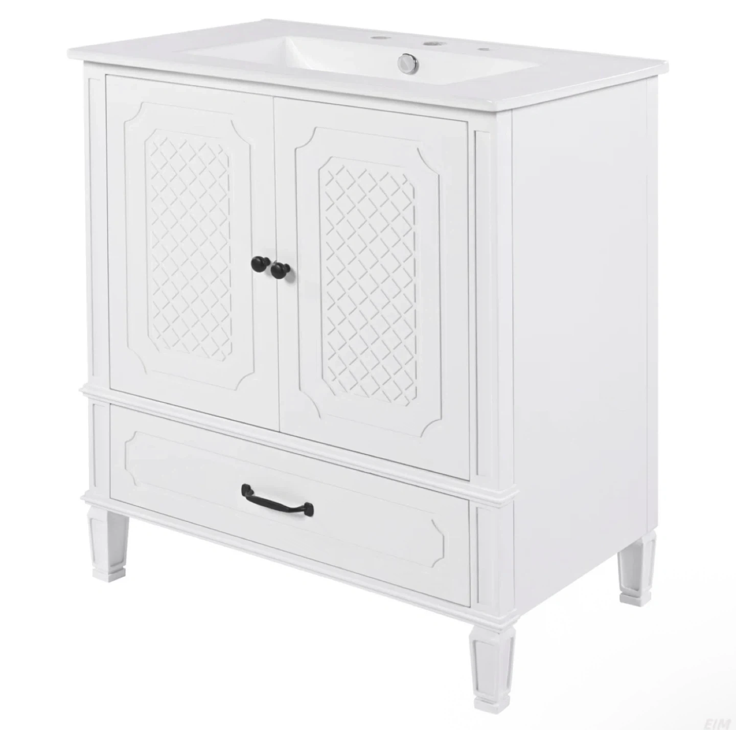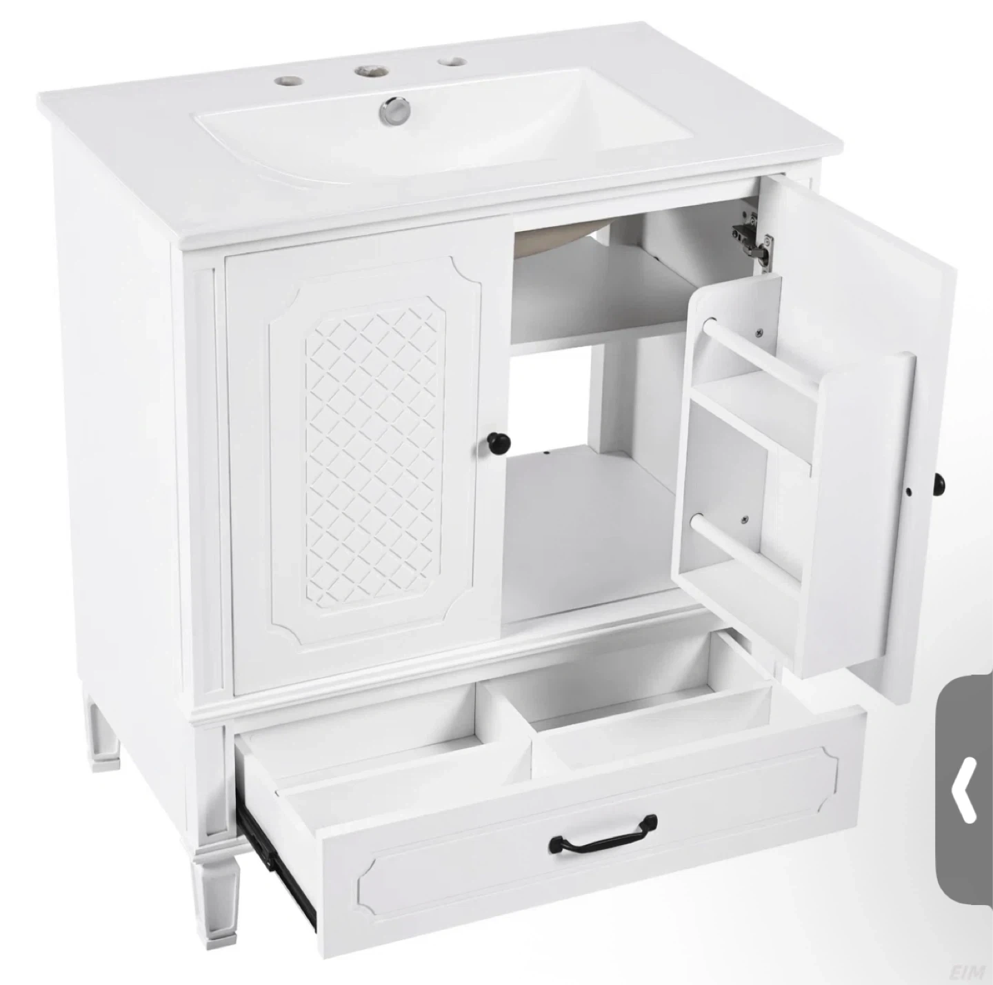 419Selling a bathroom vanity, perfect for a small space or powder room! It features a clean, white finish and includes a sink. There's plenty of storage with both a cabinet and a drawer, so you can keep your bathroom essentials organized and out of sight