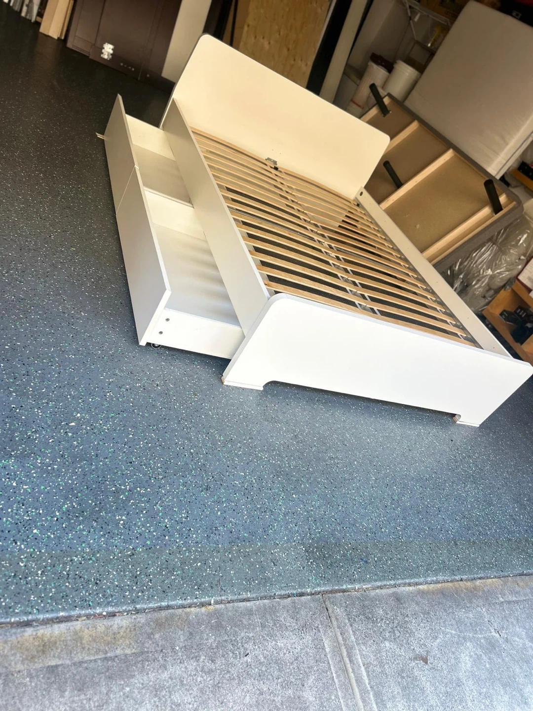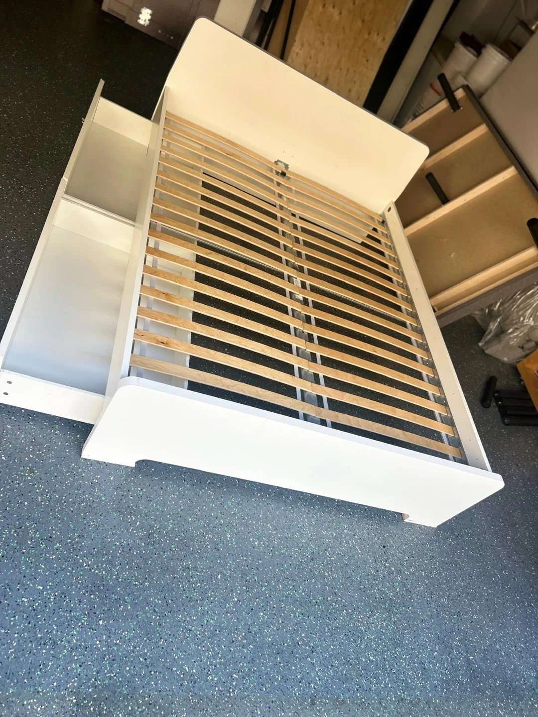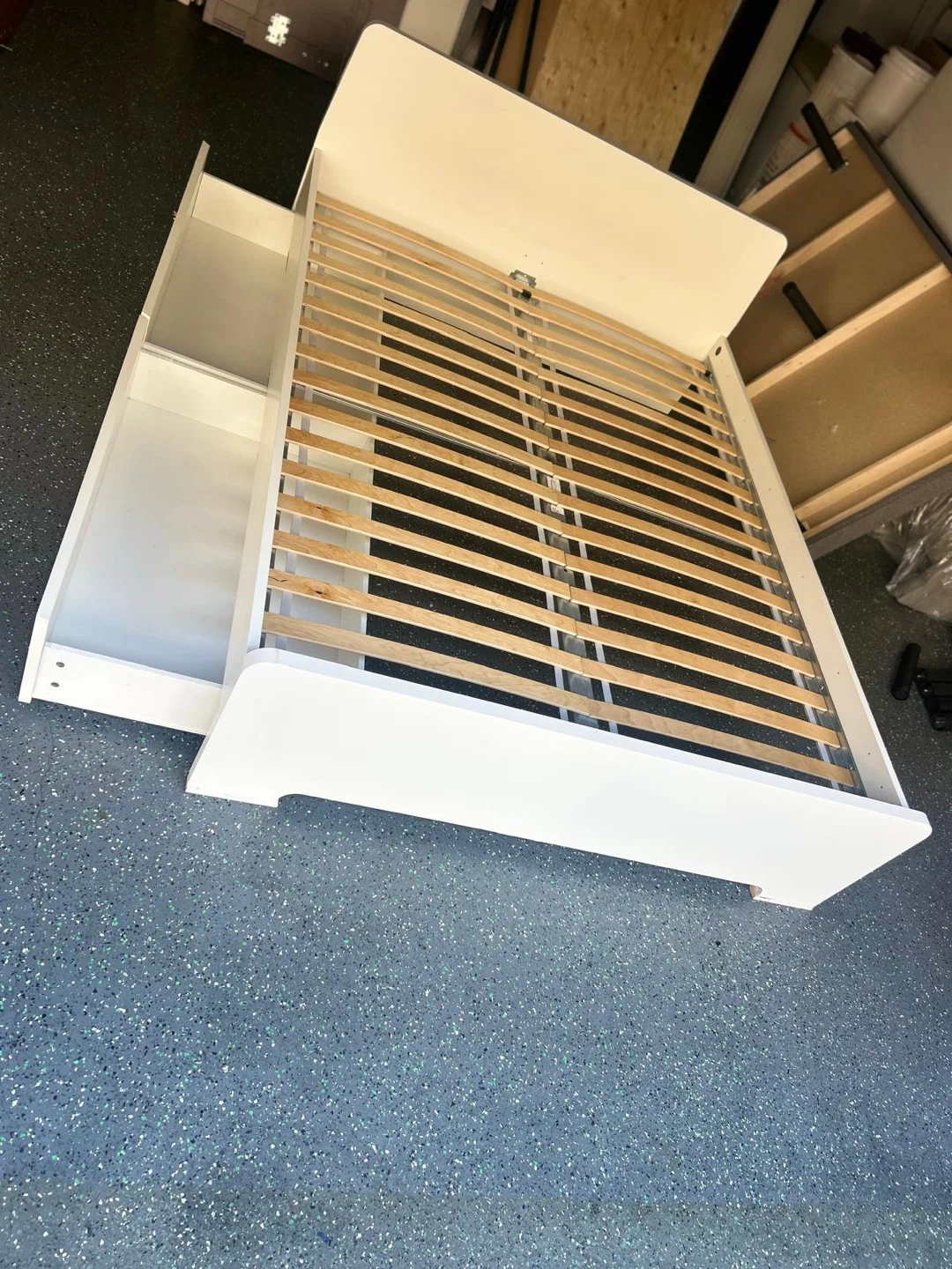 74Selling a bed frame in great condition! It's a lovely white colour and comes with built-in storage, perfect for keeping your bedroom tidy. The bed frame is sturdy and ready for a new home!