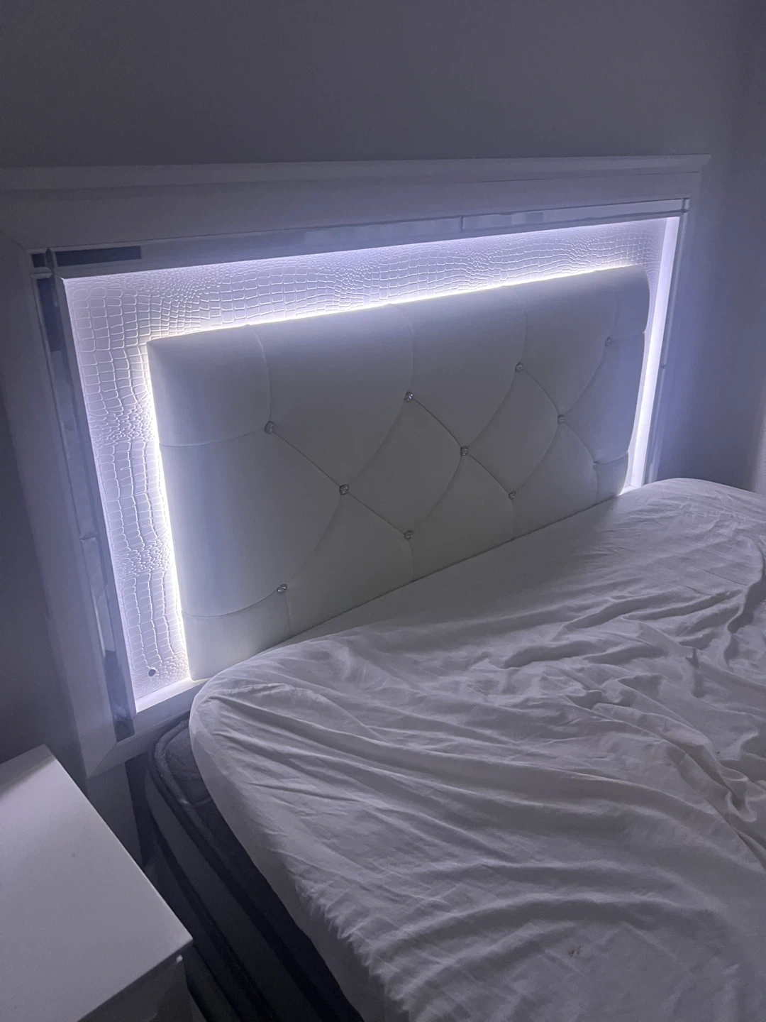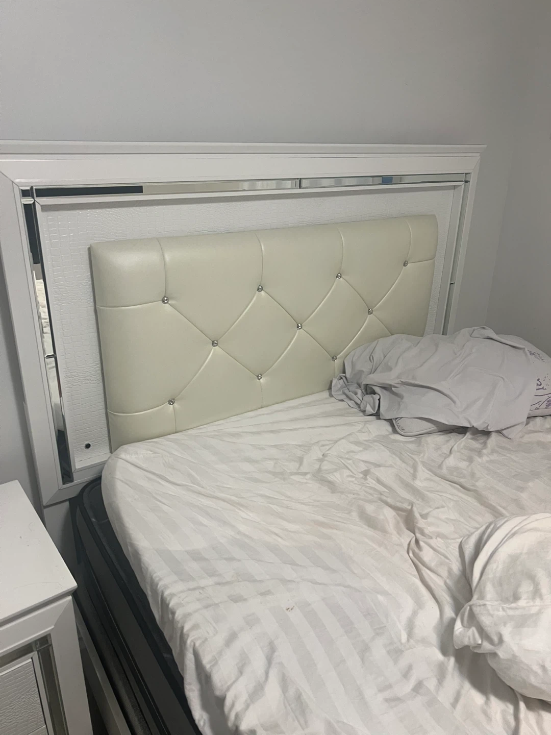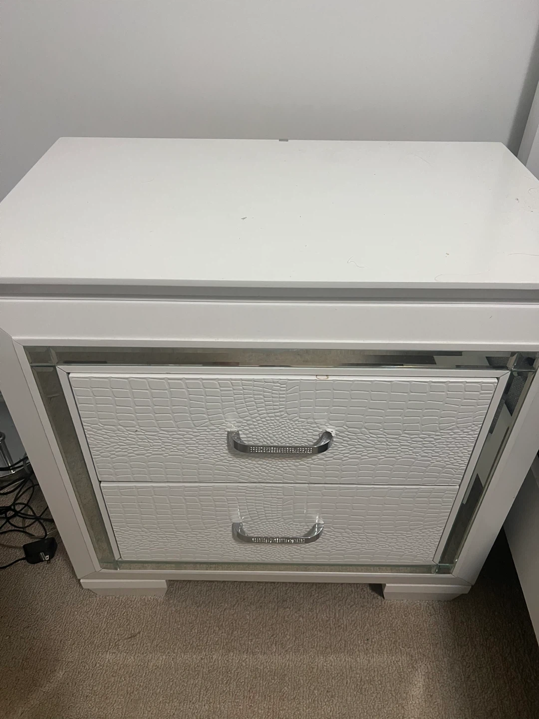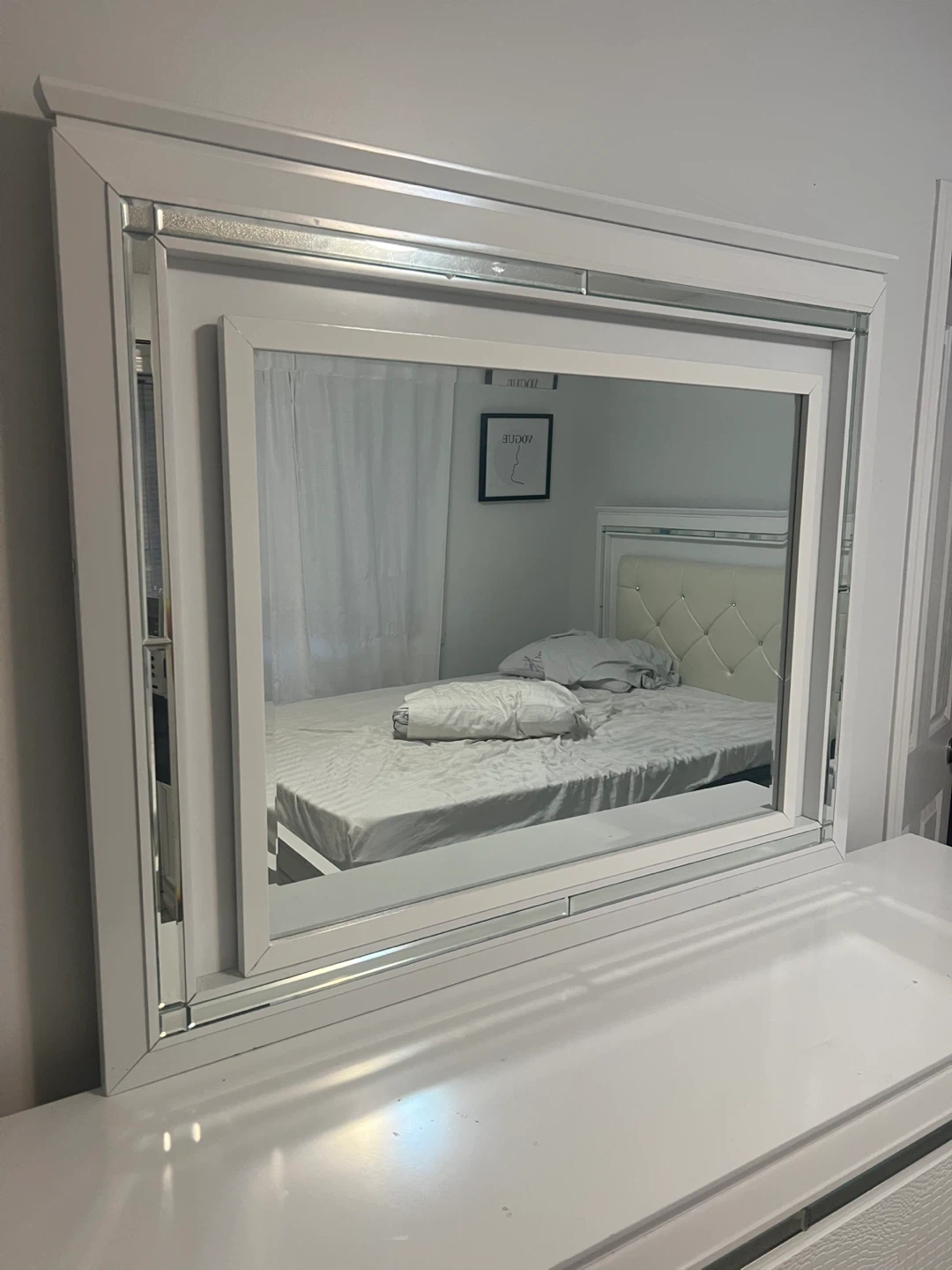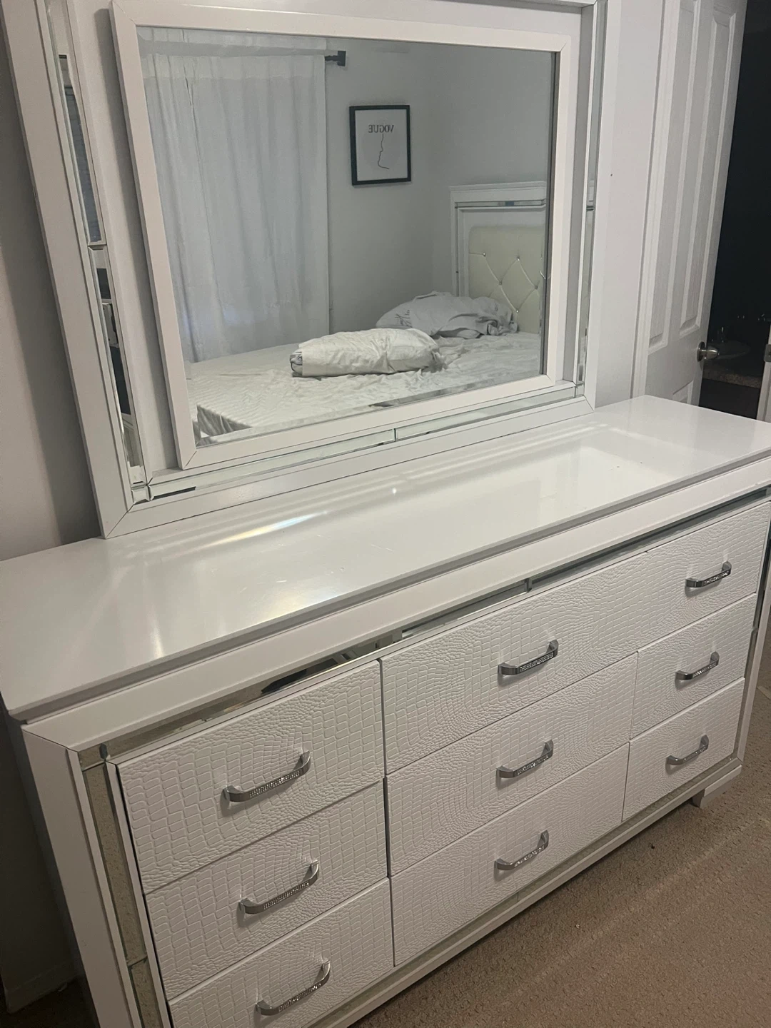 10Selling a complete white bedroom set! Includes a dresser with a mirror, a nightstand, and a headboard. The dresser features textured drawers and mirrored accents. The headboard is upholstered with diamond-patterned tufting. A great set to complete any bedroom! Looking to change my bedroom so I want to sell them. They are worth 2500 but selling for 1500