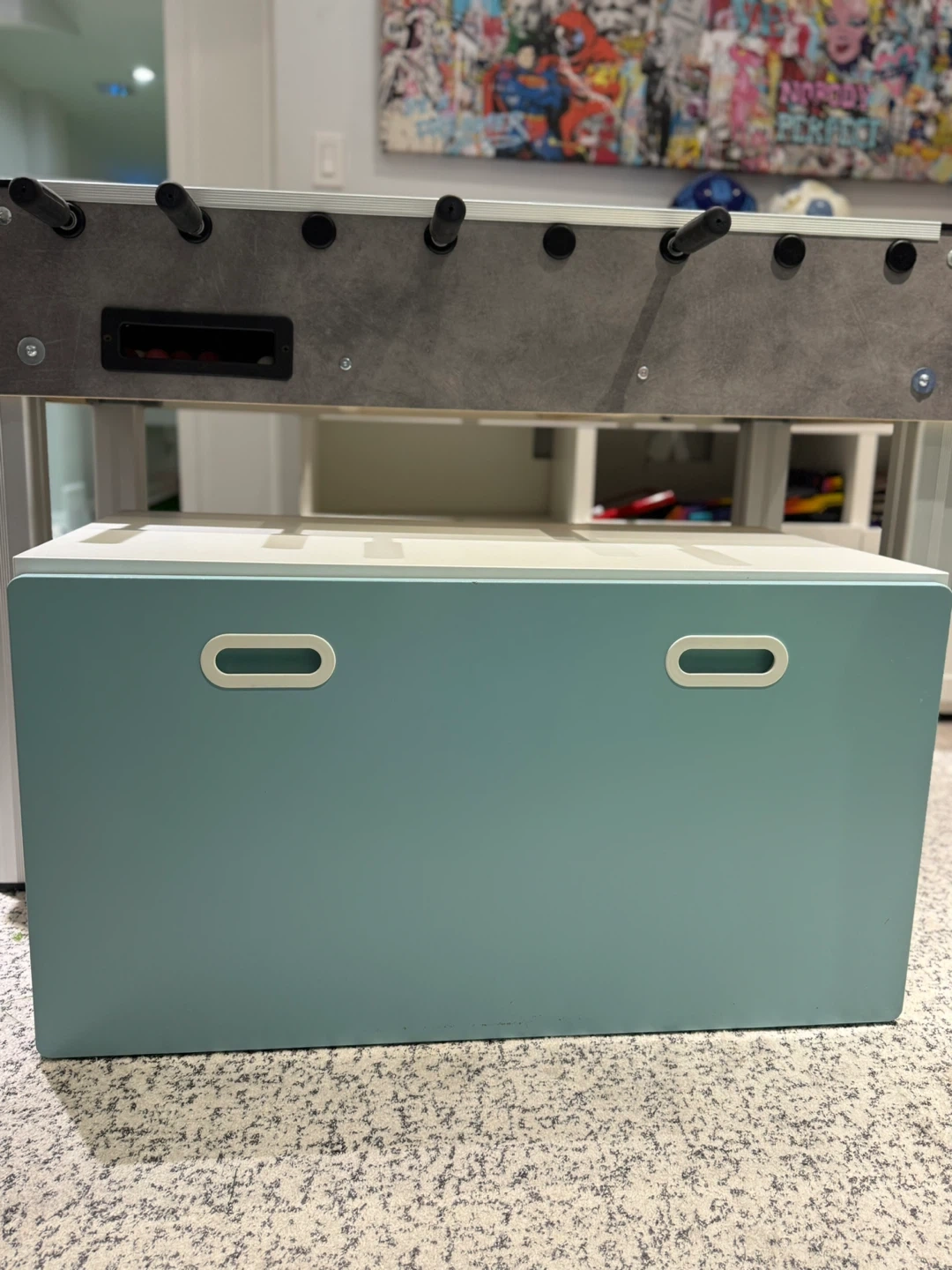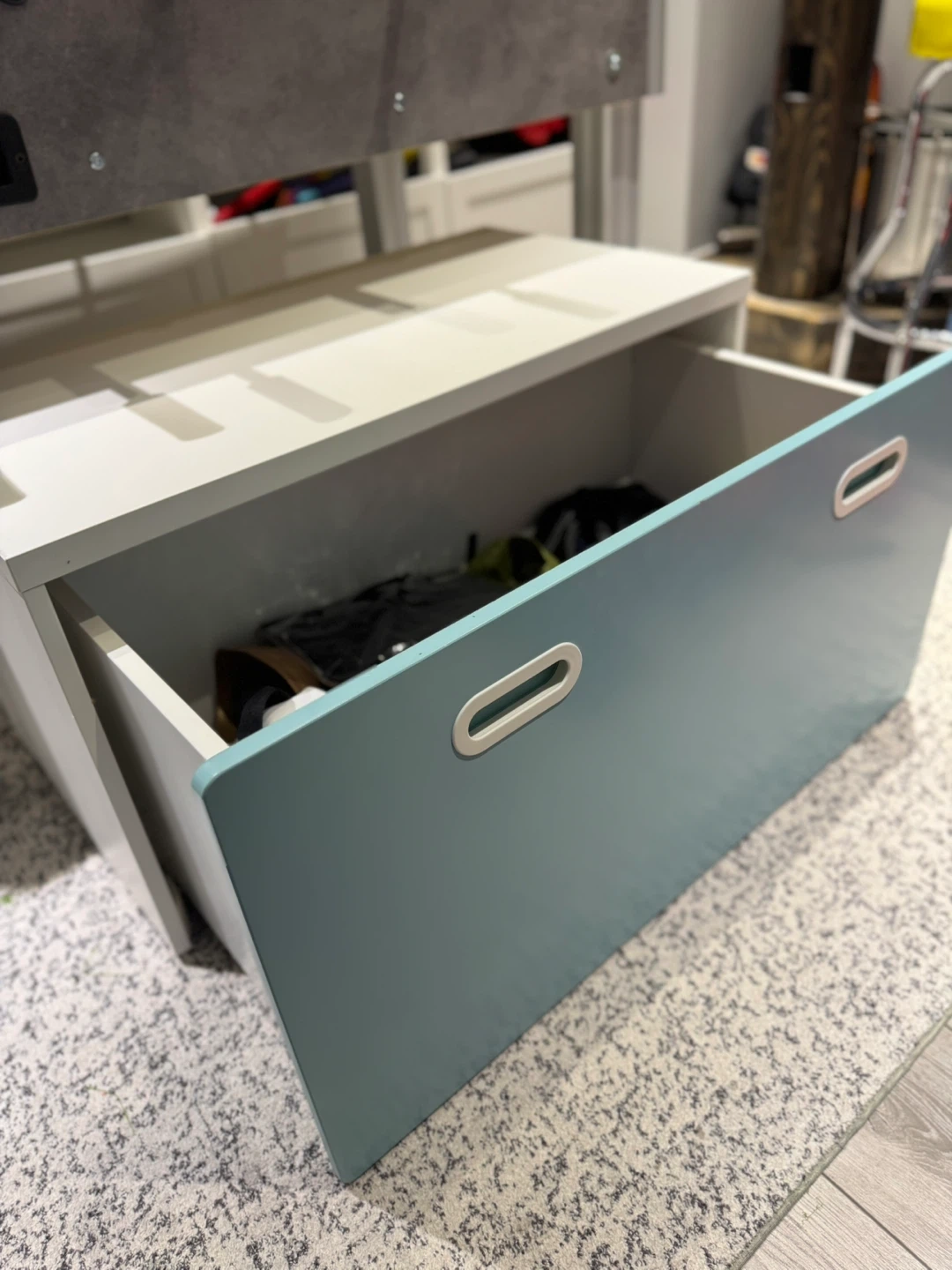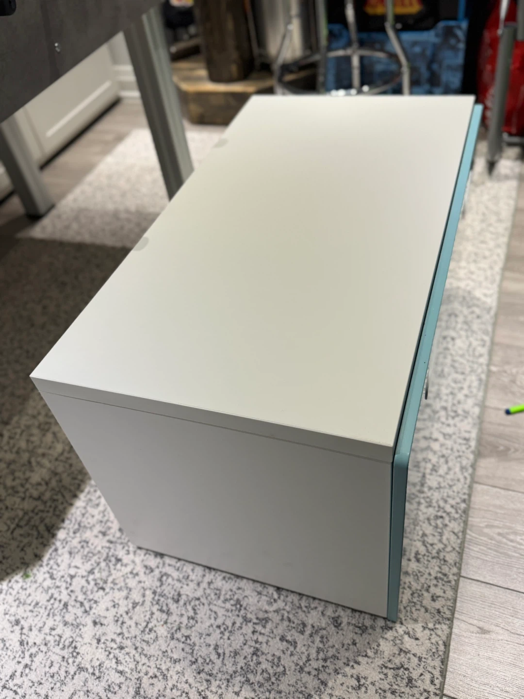 22Selling a handy storage drawer box that's in great shape! It features a clean white body with a lovely blue drawer front. Perfect for organizing toys, clothes, or anything else you need to keep tidy. The top part can also be used as a seating area (cushion included) or as additional open storage. Comes with seating cushion(s) and I am selling two units exactly the same for a good price!