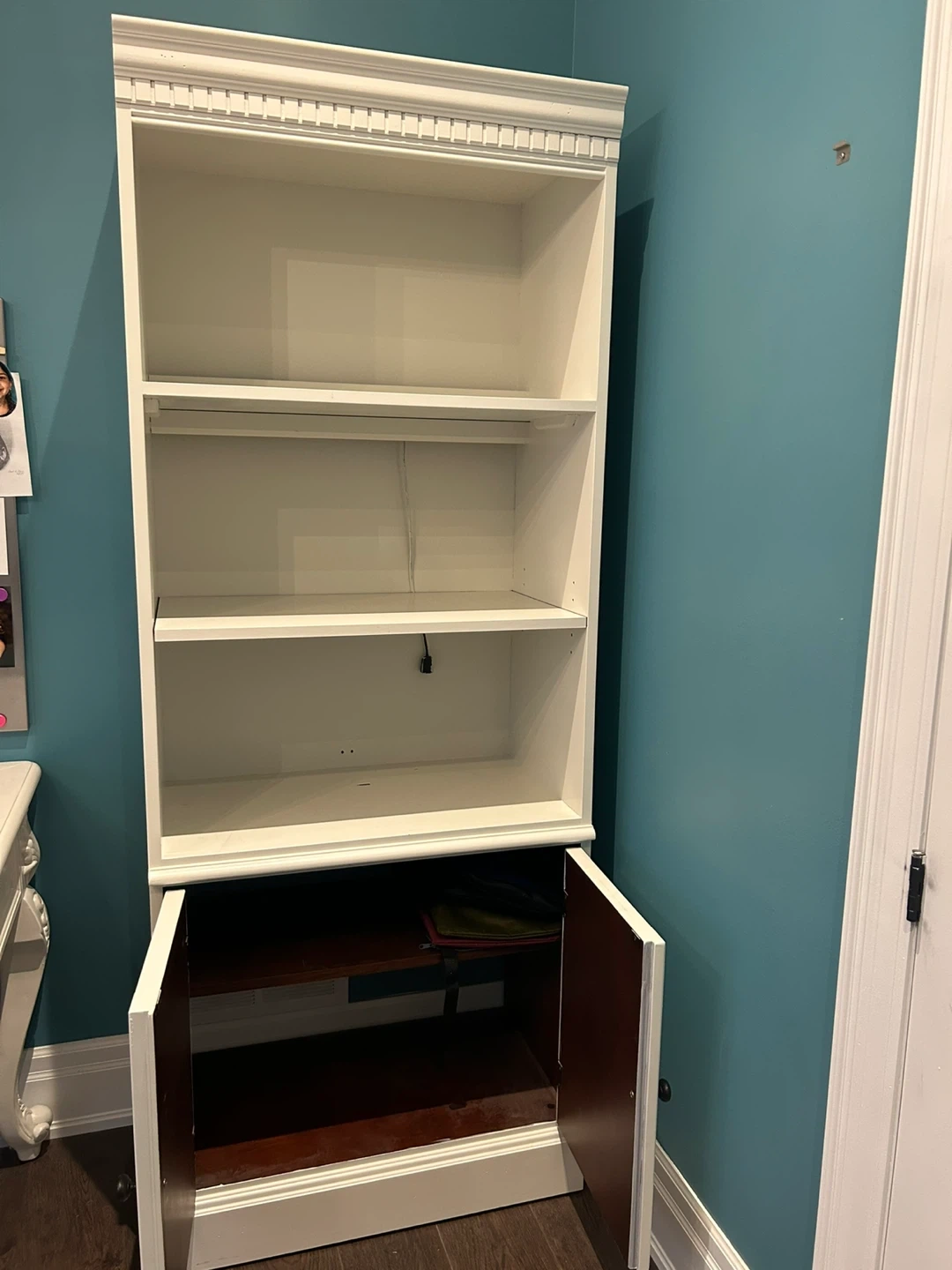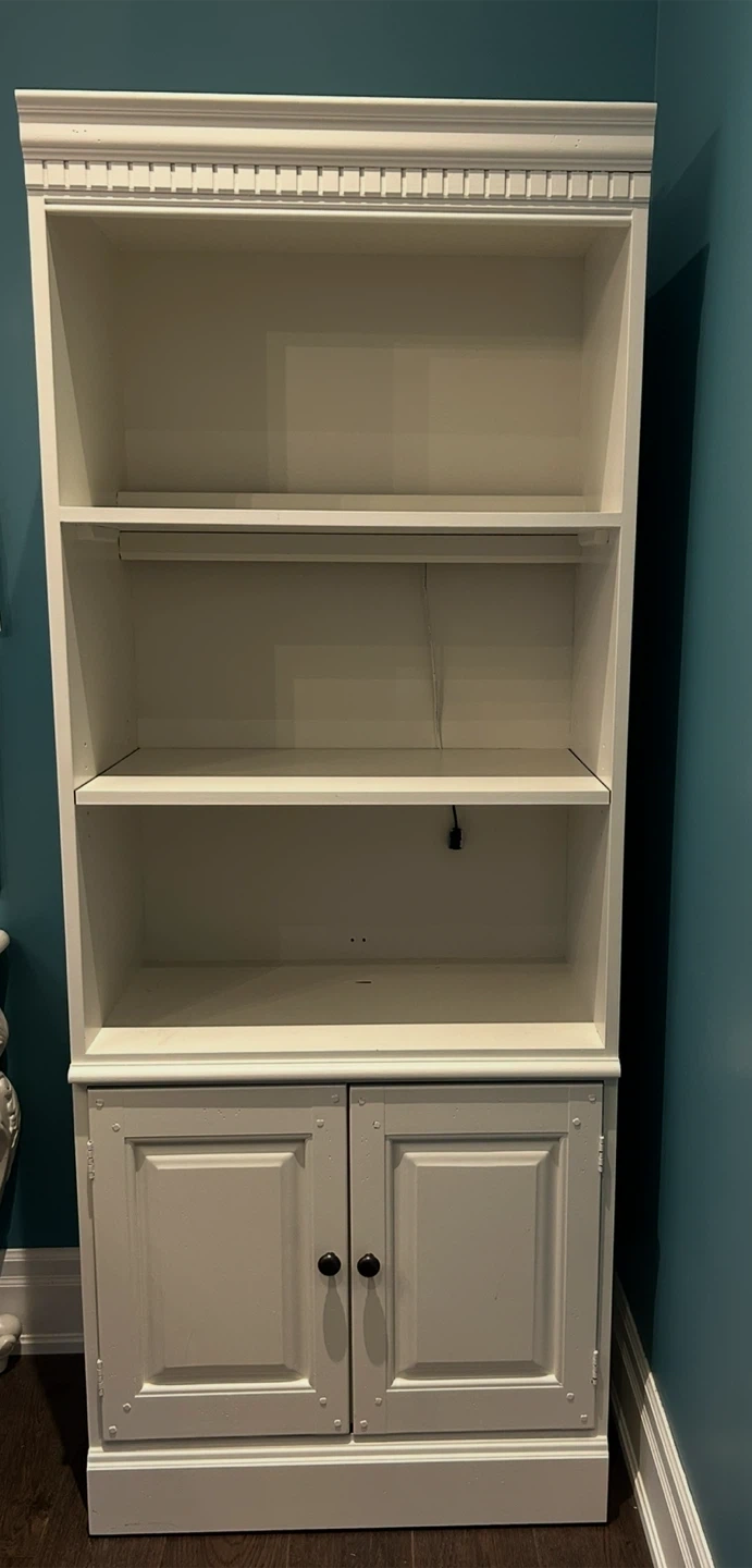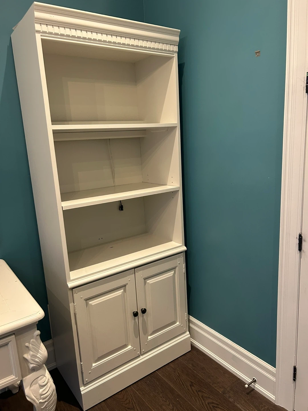 Selling a lovely white painted bookcase that would look great in any room! It features multiple shelves for displaying your favourite books and decor, as well as a cabinet at the bottom for extra storage. Some minor paint scratches on bottom shelf.