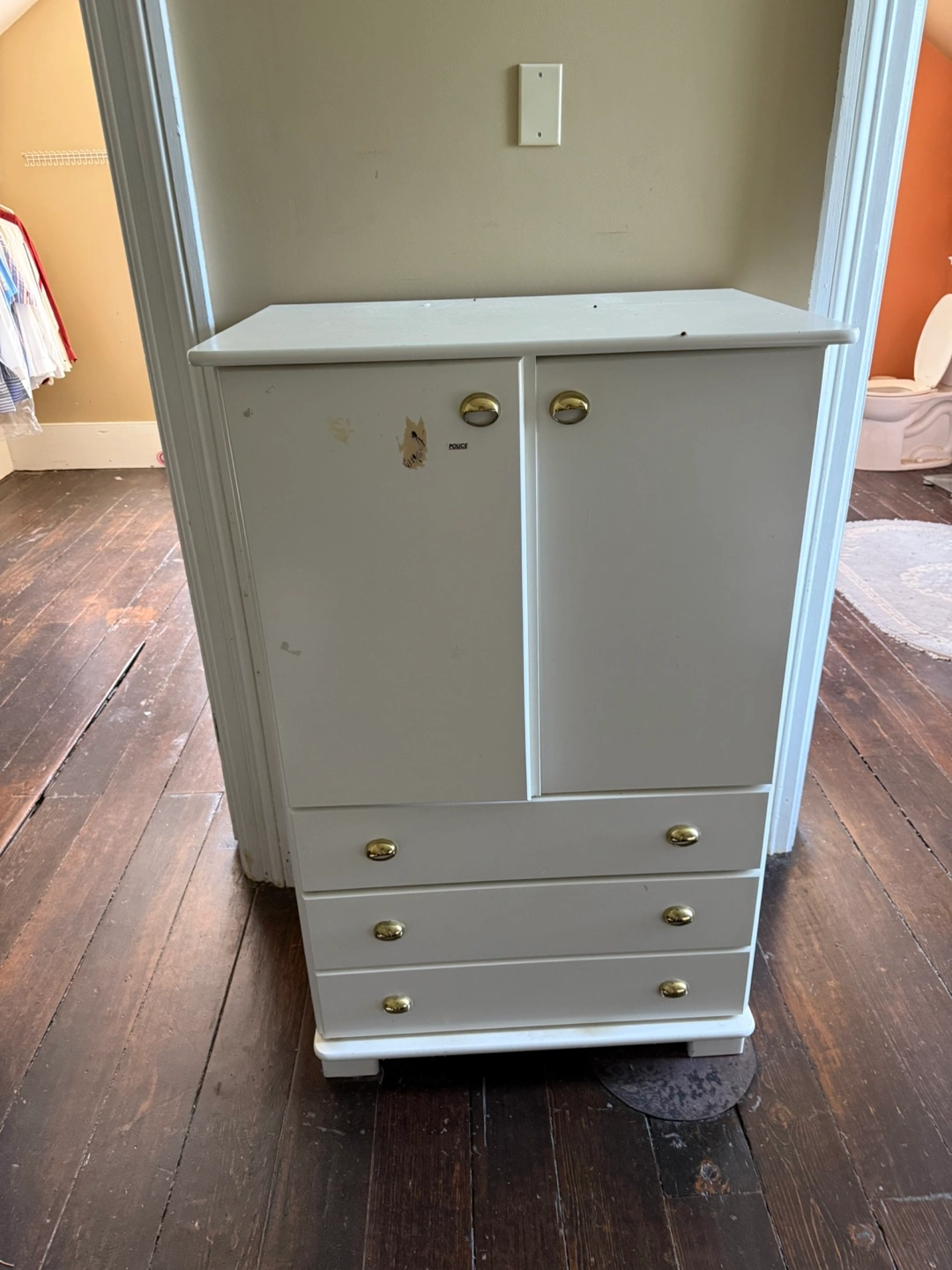 5Selling a white cabinet with drawers! It has a combination of cabinet space and drawers, offering versatile storage. The gold knobs add a touch of elegance. It has some wear and tear, but is still sturdy and functional