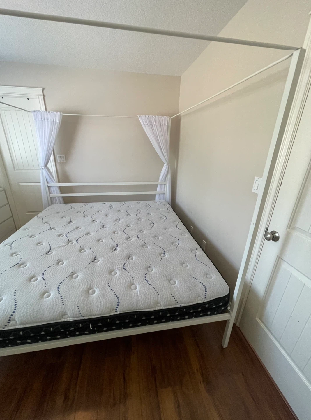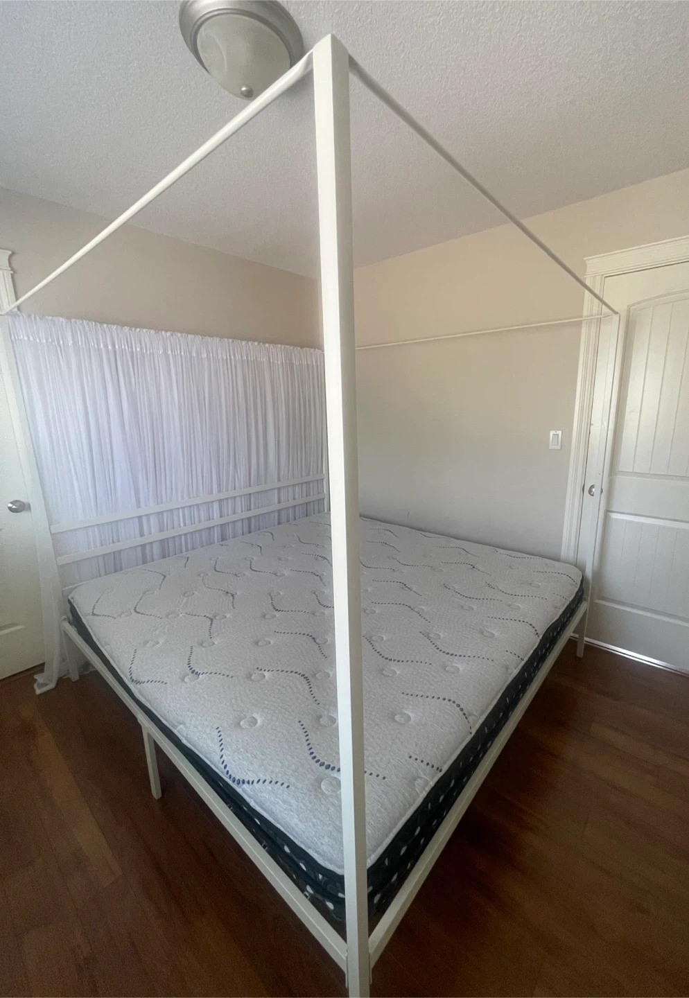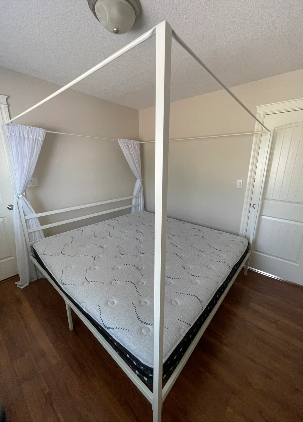 Selling a white canopy bed frame, complete with a king size mattress. It's in great condition and ready for a new home. King Size mattress, very comfortable, in excellent condition. Purchased from Sleep Country. It is too big for my bedroom. The canopy bed frame is a sturdy, solid bed frame and it was purchased from Wayfair. I’m selling both together for $600. Or, king size mattress alone for $450. Canopy Bedframe alone for $220. Pick up only.