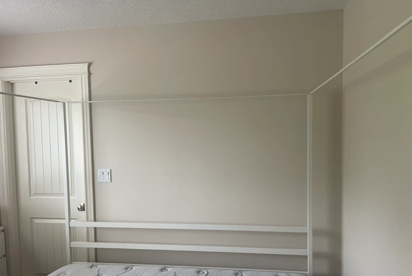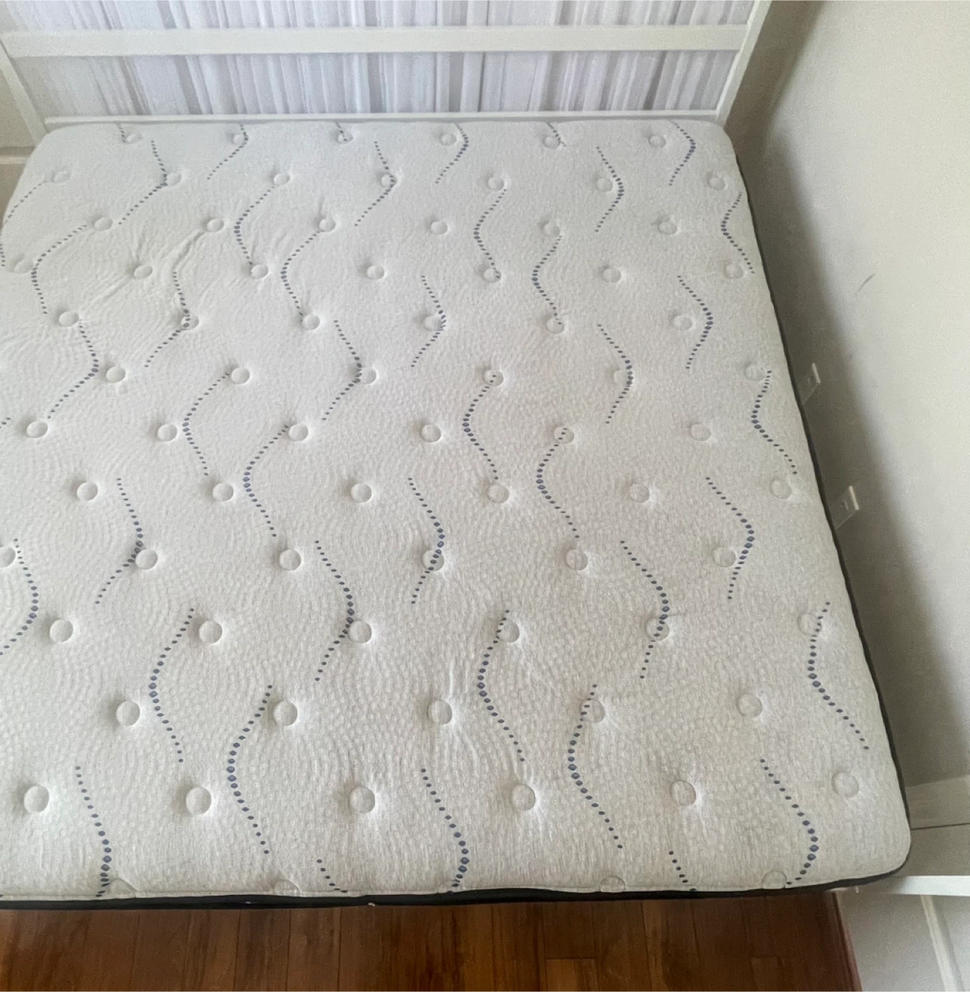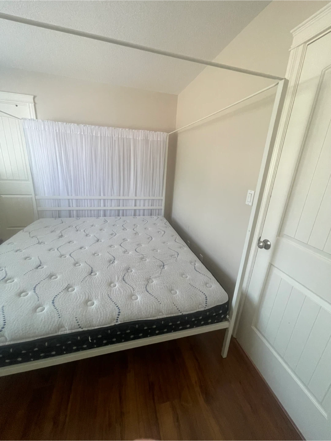 Selling a white canopy bed frame, complete with a king size mattress. It's in great condition and ready for a new home. King Size mattress, very comfortable, in excellent condition. Purchased from Sleep Country. It is too big for my bedroom. The canopy bed frame is a sturdy, solid bed frame and it was purchased from Wayfair. I’m selling both together for $600. Or, king size mattress alone for $450. Canopy Bedframe alone for $220. Pick up only.