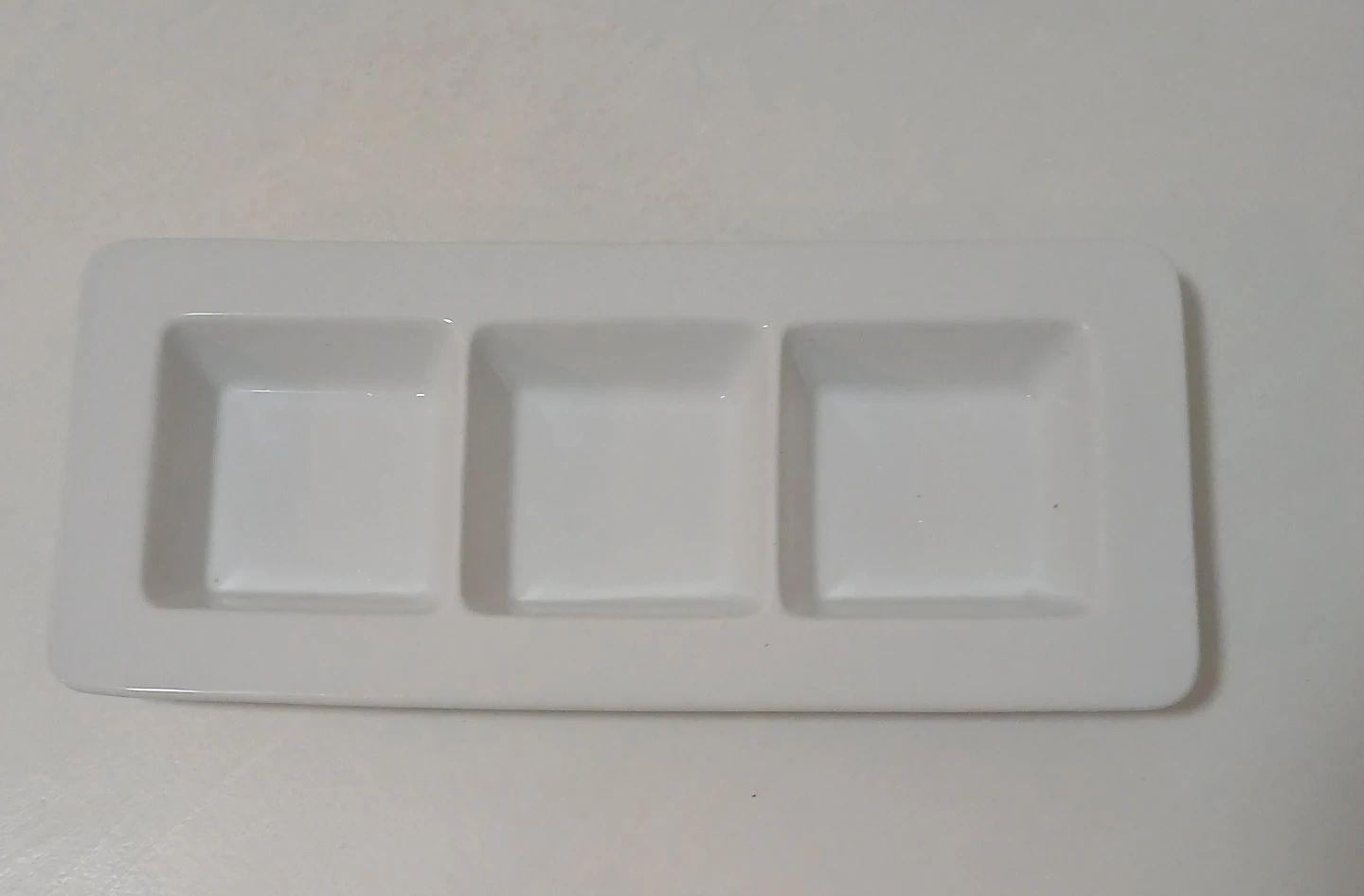 419Here's a white ceramic tray with three compartments, perfect for serving condiments or snacks. It's in great condition and ready for a new home!