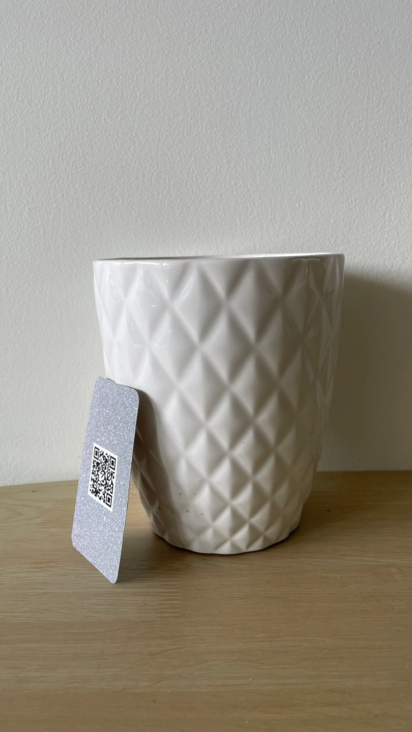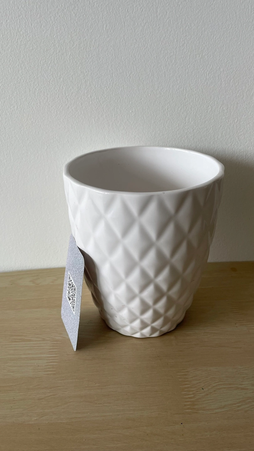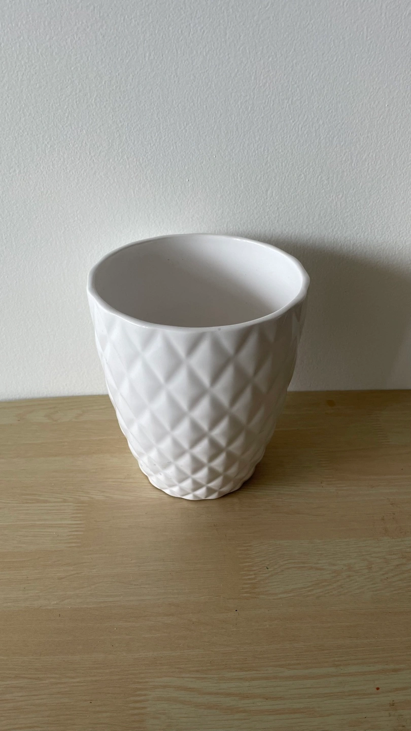 Selling a white ceramic flower pot. It has a nice geometric pattern on the outside. Perfect for indoor plants!