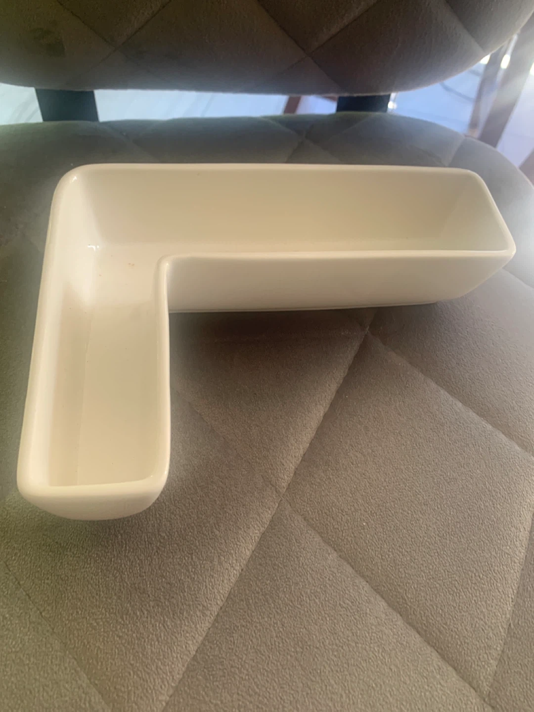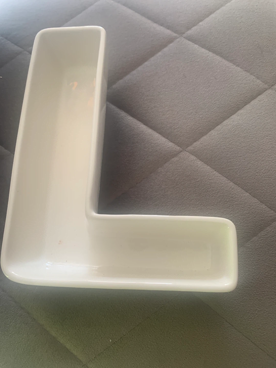 Here's a unique white ceramic tray in an L-shape! It could be used for holding small items or as a decorative piece