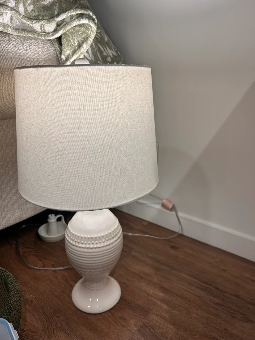 10Selling a lovely white ceramic table lamp! It's in great condition and would look perfect in any room. The base has a nice textured design, and the shade is a neutral colour. It provides a soft and warm light