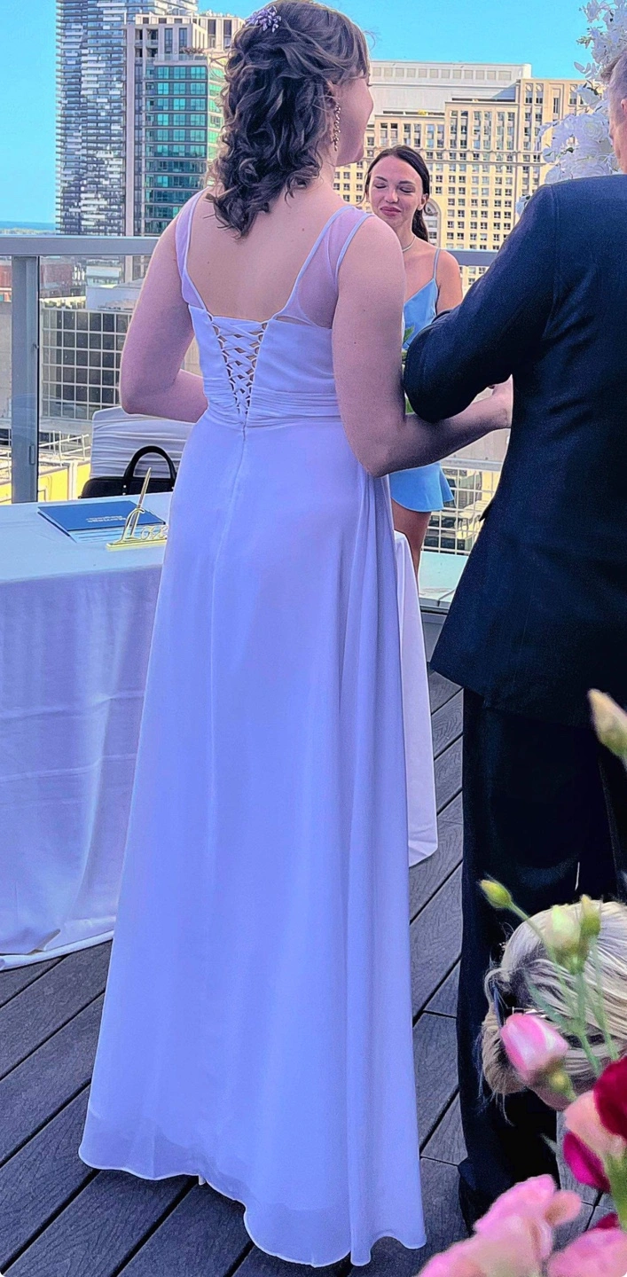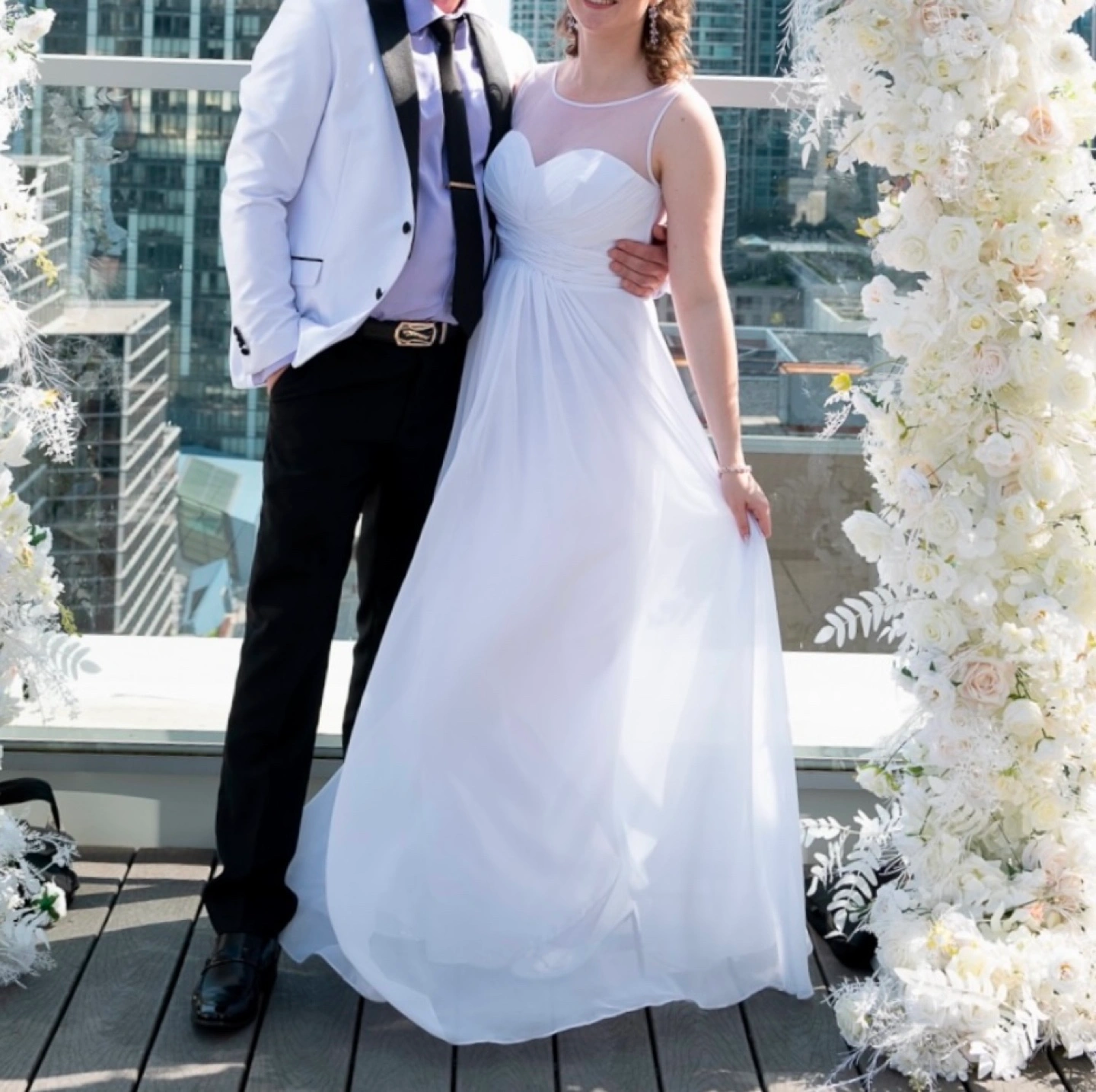 Elegant and classy light wedding dress, worn only once and professionally dry-cleaned with no spots or imperfections. Comes from a smoke-free home and includes a protective cover. Perfect for those who wear Medium, with an adjustable bust as the back can be tightened to fit as needed. I am 173 cm tall, and the dress was a perfect fit with low heels and also worked beautifully with flats. Designed for ultimate comfort, it ensures you feel confident and stunning on your special day.