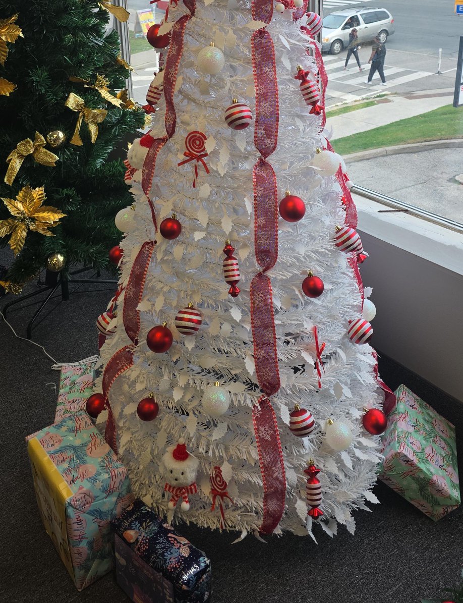 Get ready for the holidays with this charming white Christmas tree! It comes decorated with a mix of red and white ornaments and festive ribbon. A perfect addition to brighten up any room this season 180cm