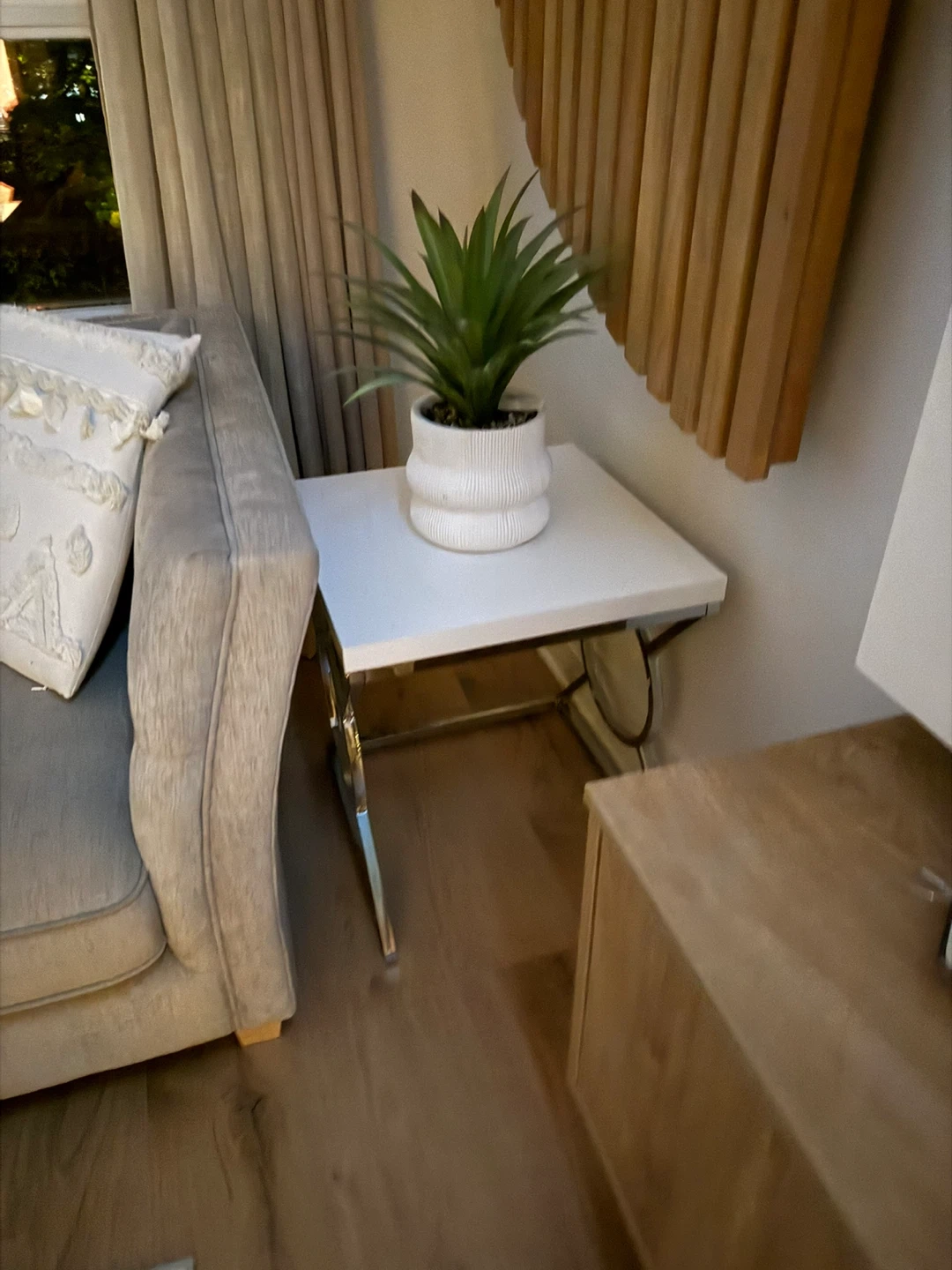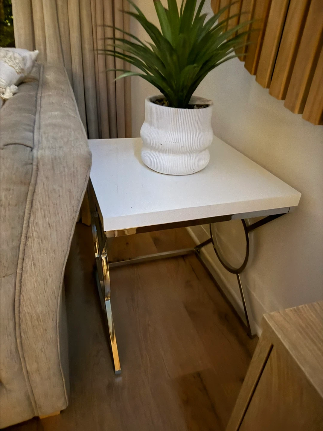 60Selling a stylish side table with a white top and chrome-finished legs. It's perfect for adding a touch of modern elegance to any room. It's in great condition! Pickup near Bayview and 401 (Bayview Village area) Beautiful coffee table plus matching set of two modern white chrome side tables. Sleek and contemporary design with glossy white tops and polished chrome bases. Perfect for living rooms, bedrooms, or offices. Excellent condition sturdy, clean, and stylish. 1. Dimensions: approx. 22” L x 22” W x 20” H 2. Material: high-gloss white top with chrome metal base 3. No scratches or damages 4. Smoke-free, pet-free home