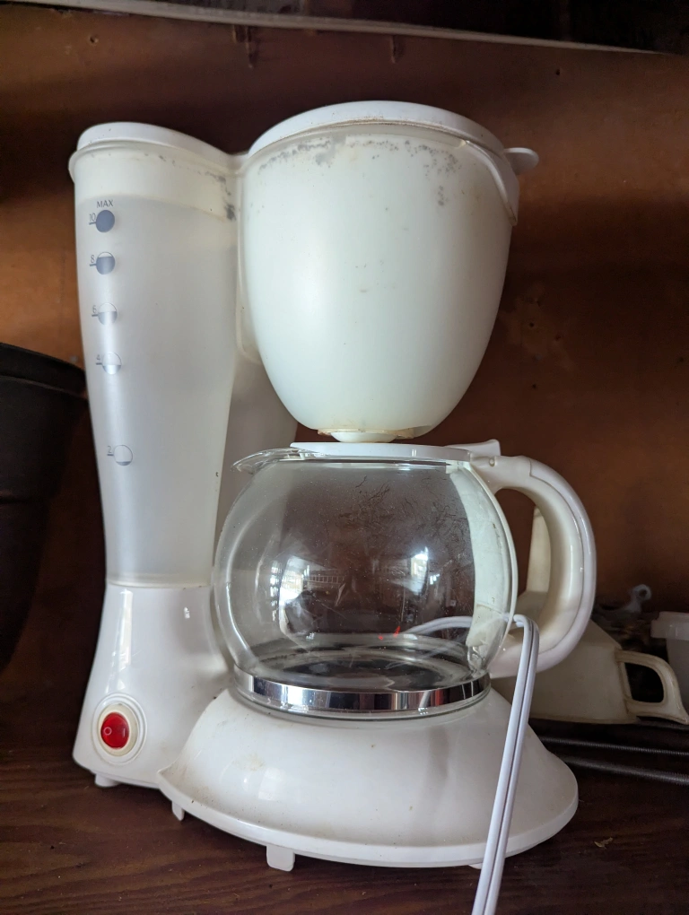 Used coffee maker. Features a glass carafe and water reservoir. Shows some staining. Cord included.