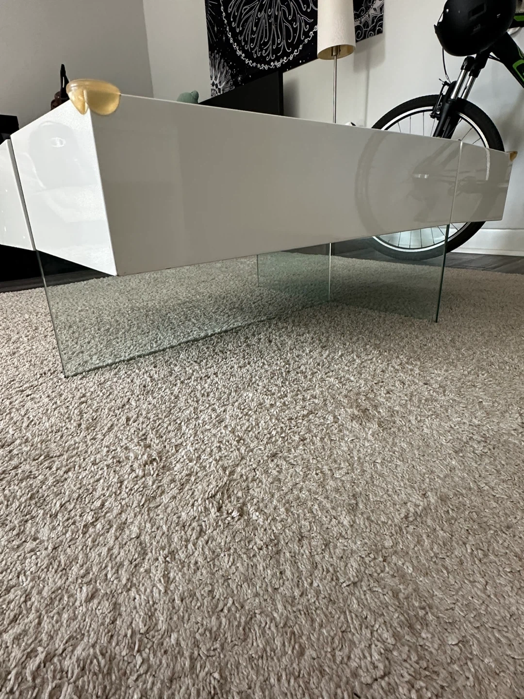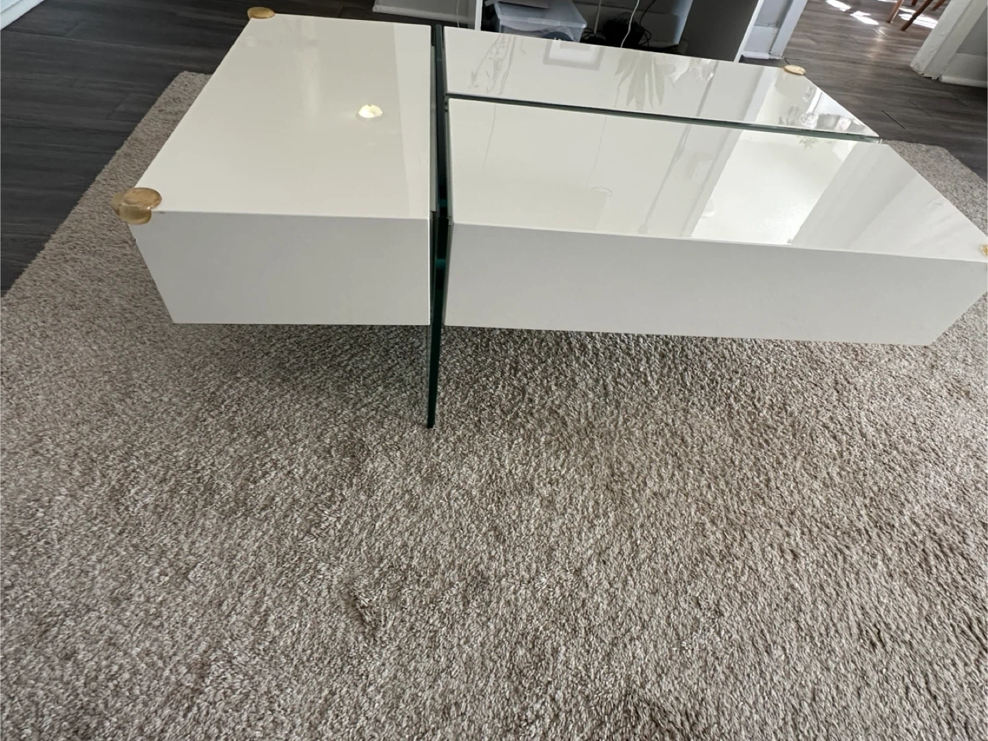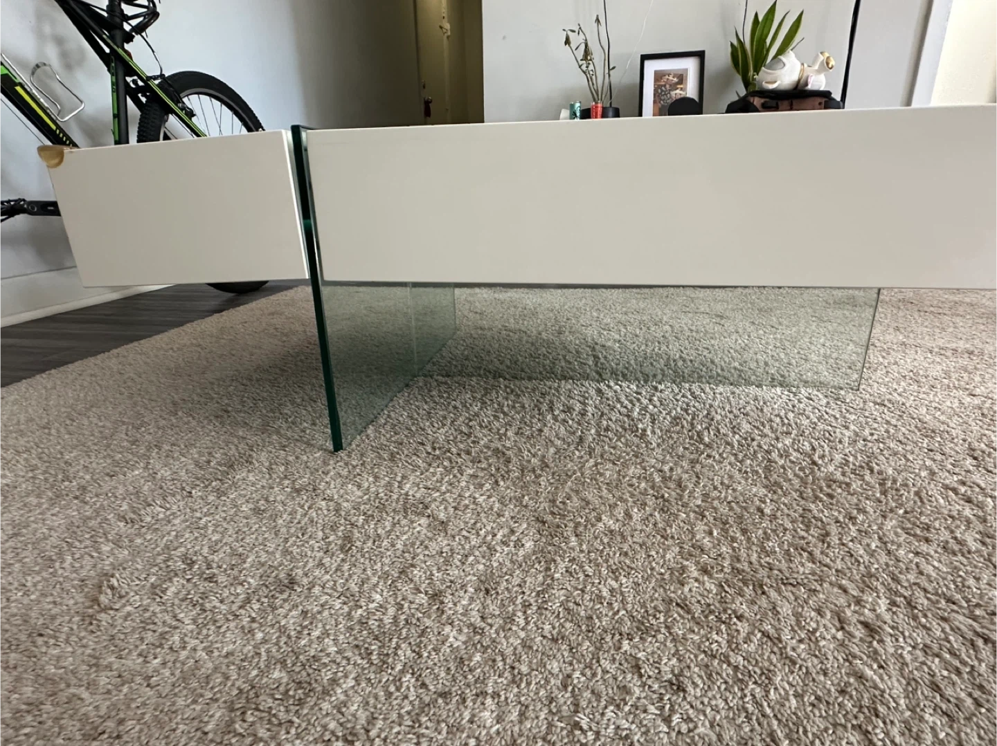 Selling a stylish white coffee table featuring glass legs. Storage inside