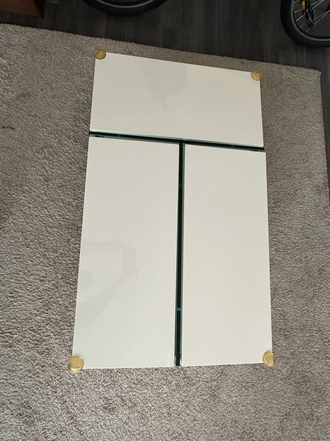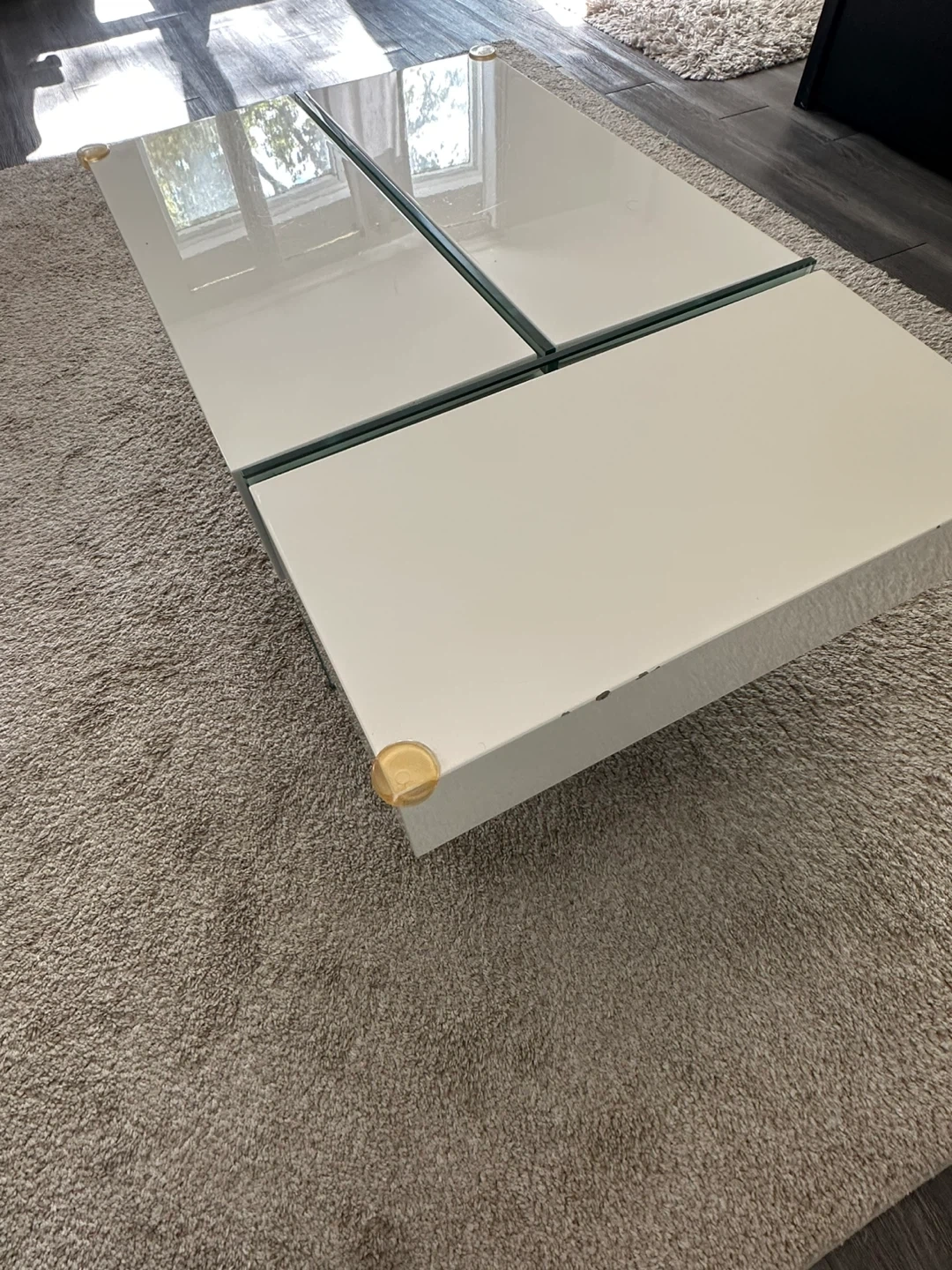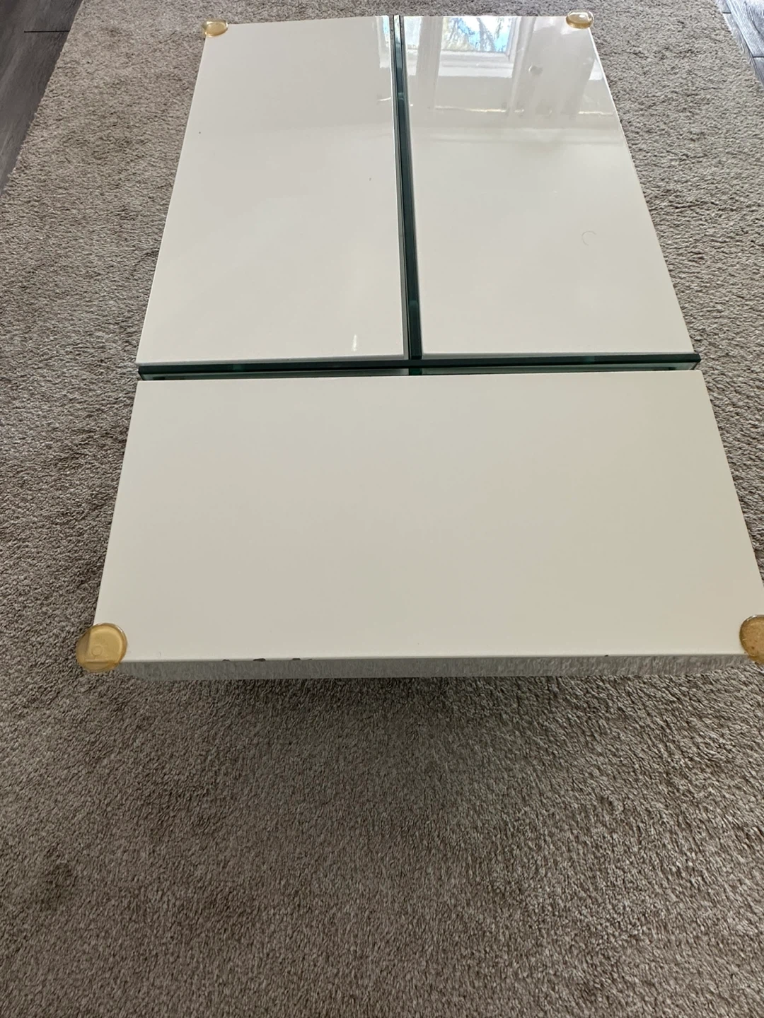 Selling a stylish white coffee table featuring glass legs. Storage inside