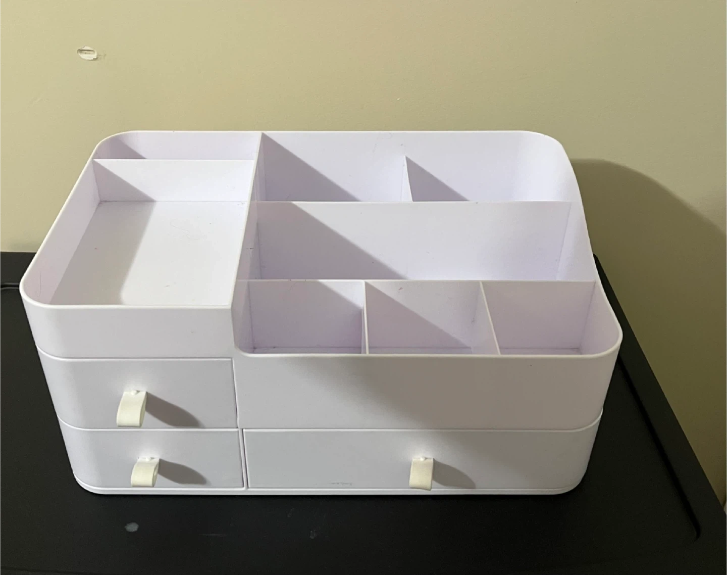 141Selling a handy white cosmetic organizer! It has multiple compartments and drawers to keep all your makeup and skincare products neatly organized. Great for decluttering your vanity or bathroom counter!