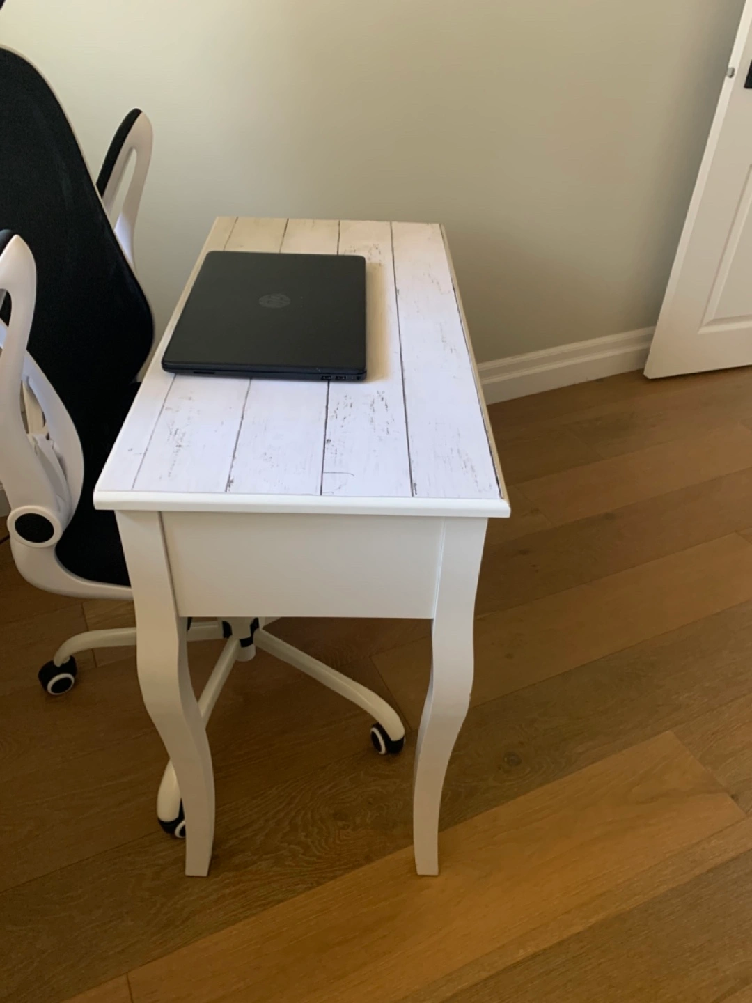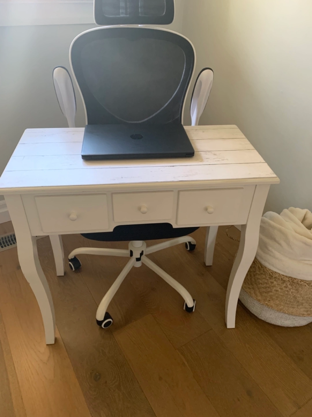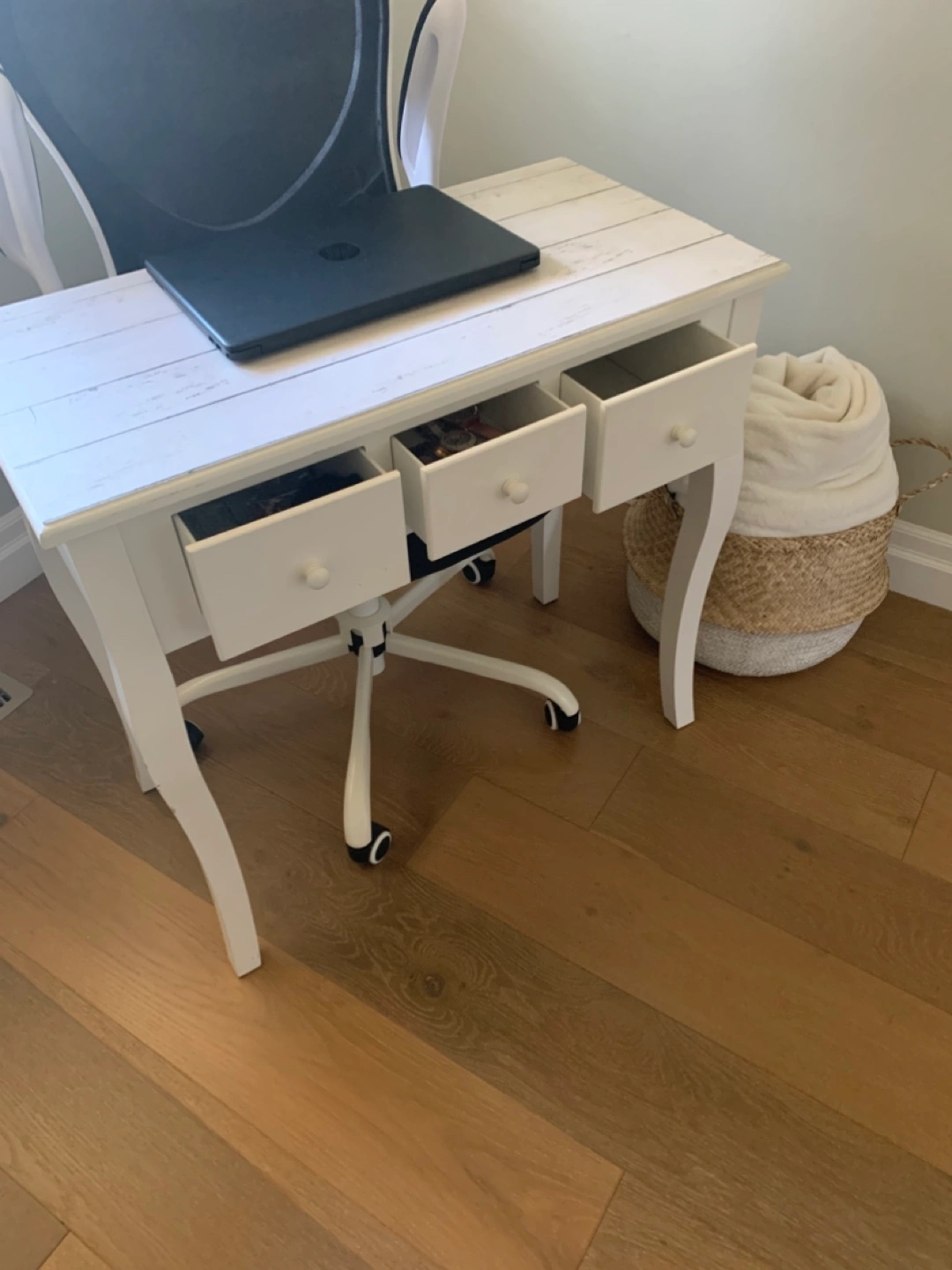 Small white writing desk. Three drawers. Whitewashed plank desktop. Curved legs. Perfect for a small space. Can also be used as a makeup desk. Desk chair and accessories not included.