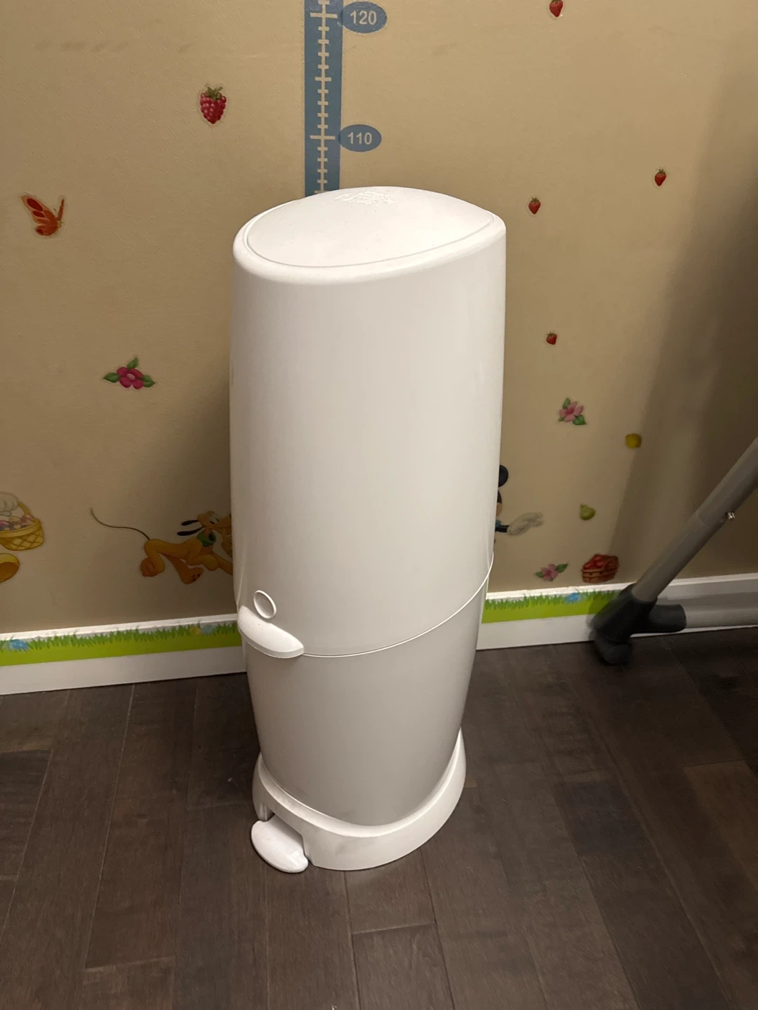 Selling a diaper pail in great condition! It's perfect for keeping the nursery smelling fresh and clean. The pail is white and easy to use with a foot pedal for hands-free operation. It’s a must-have for any new parent!