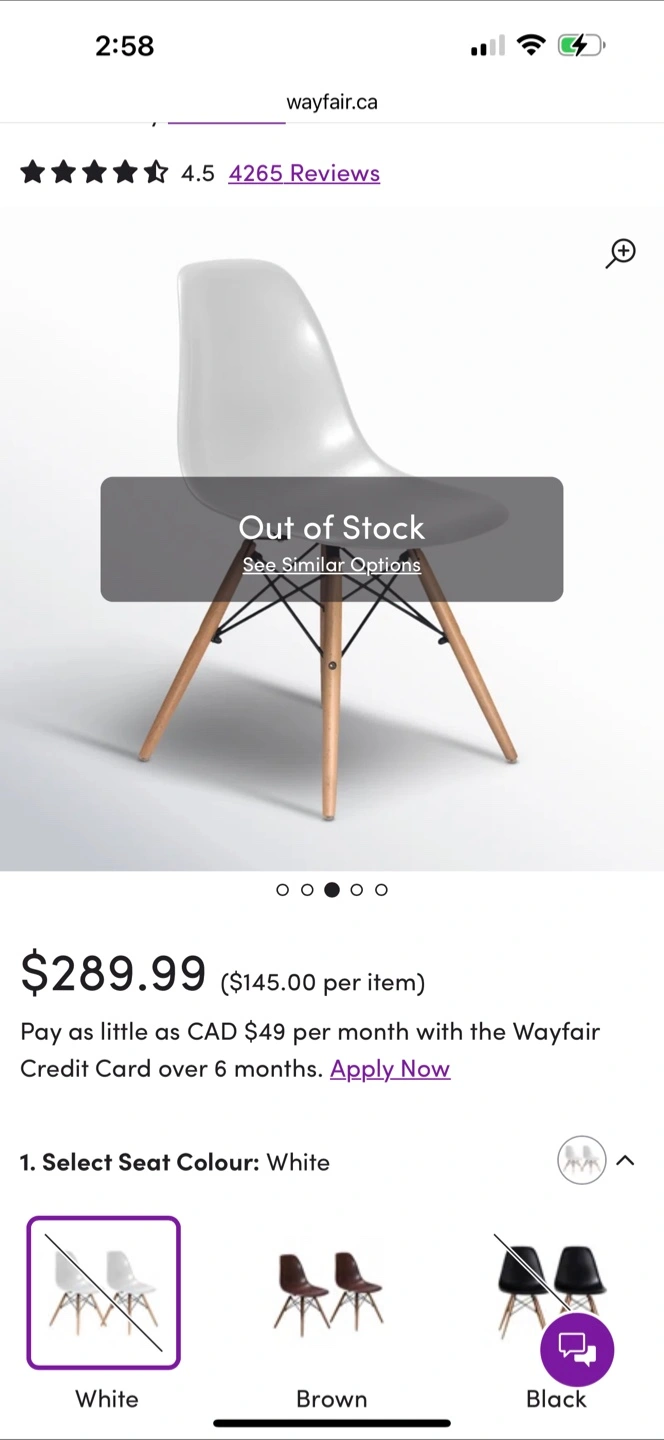 Selling, As Is, a set of four white dining chairs still in the box. The product size is 52*46*81cm. The box also indicates that the net weight is 14.5kg and the gross weight is 16.5kg. The carton measures 53*47*48cm. This SKU has 1 master carton.