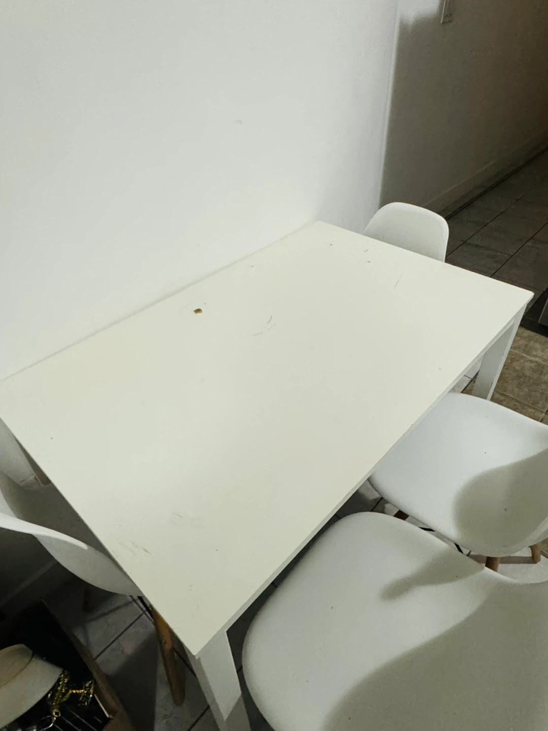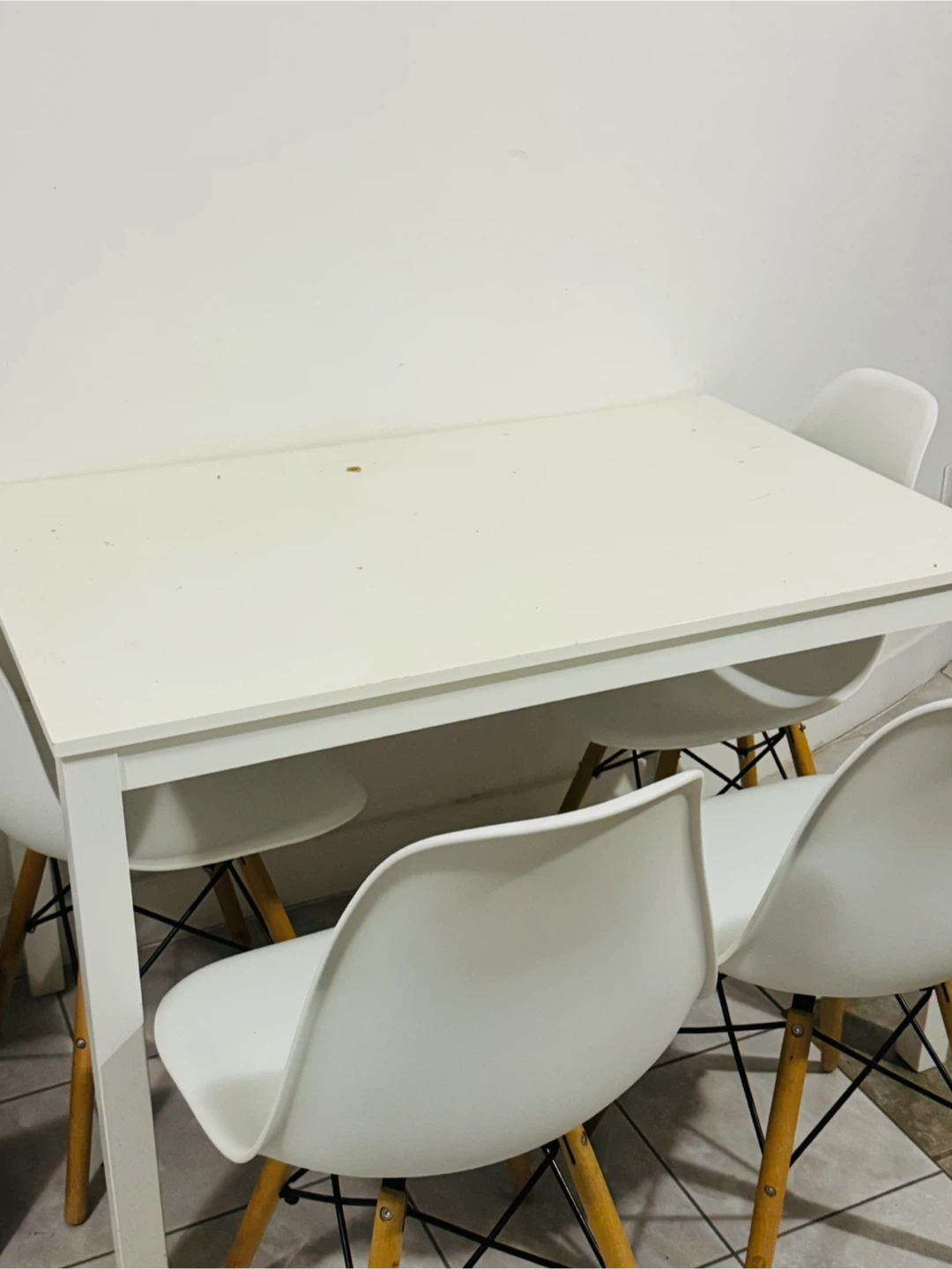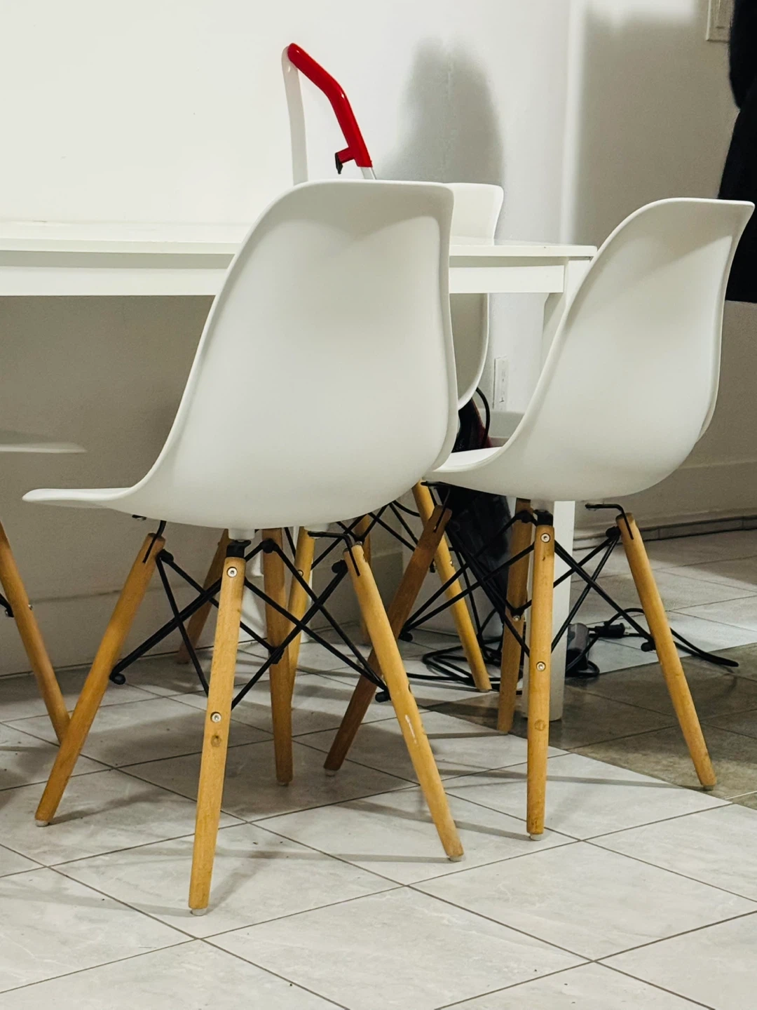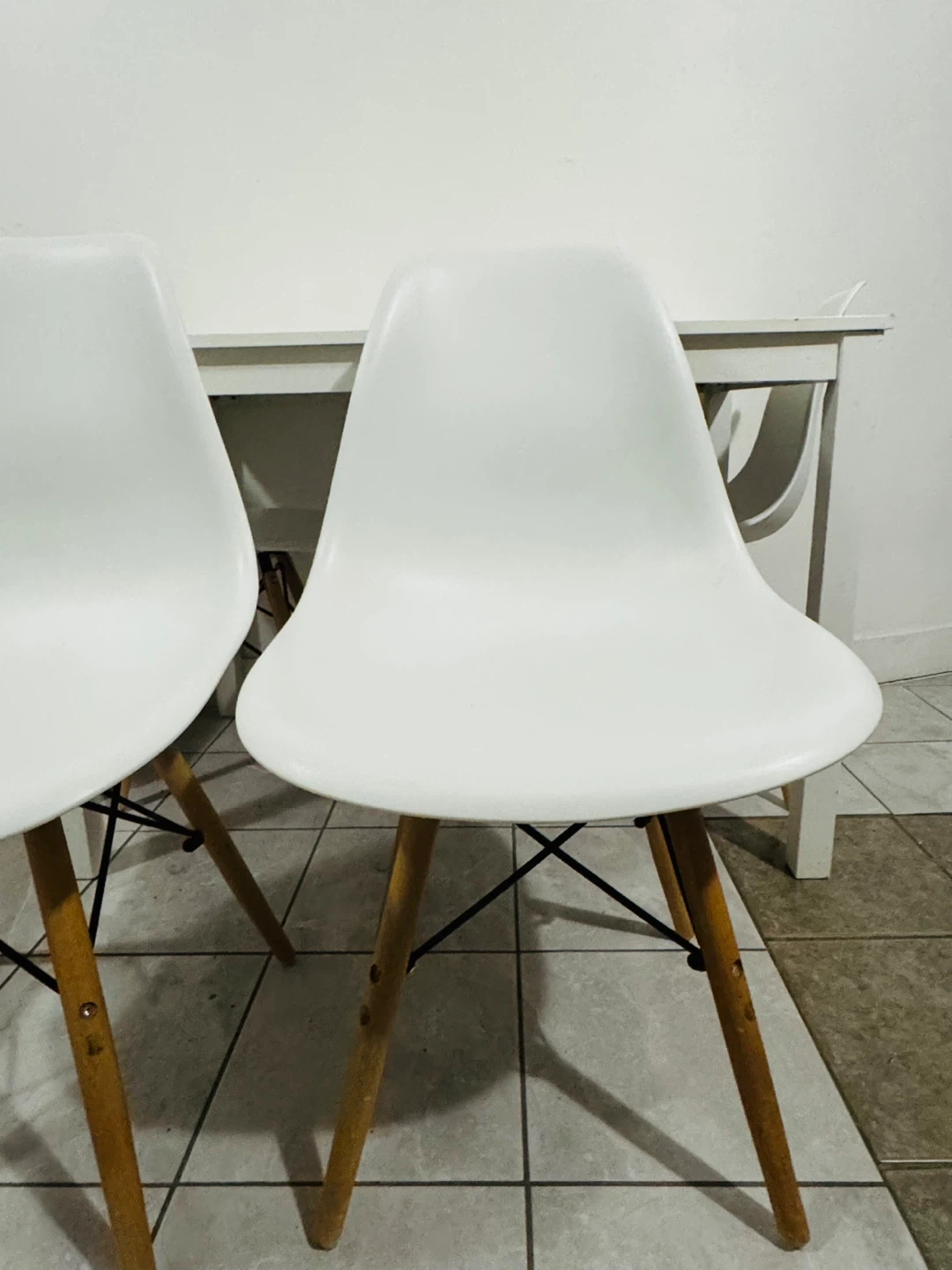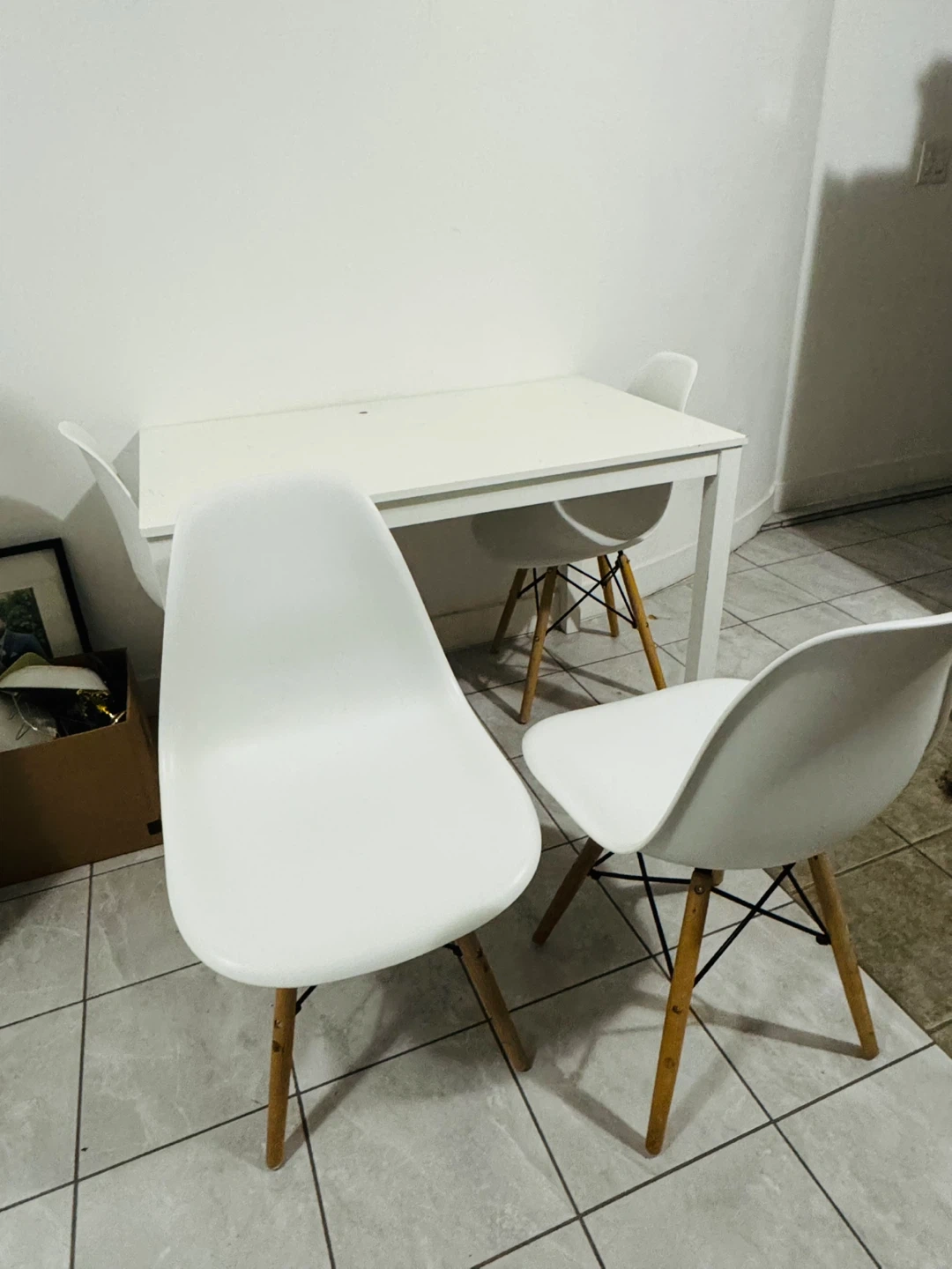 30Selling a dining table with four Eiffel Eames style chairs. The set is in good condition and ready to brighten up your dining space! The chairs have a white plastic seat with wooden legs and black metal supports. The table has some scratches. $ 20 per chair $10 for the table