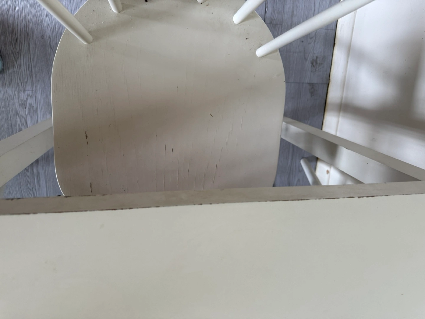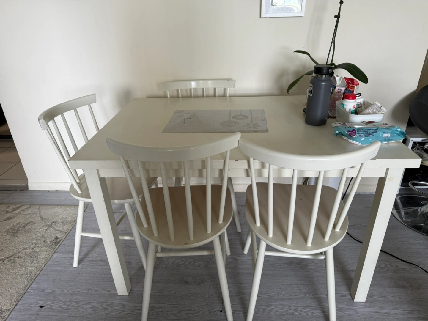 12Selling a charming white dining table complete with four matching chairs. It's a great set for a small dining area or kitchen. The set has some paint tares but still in good condition and ready to find a new home.