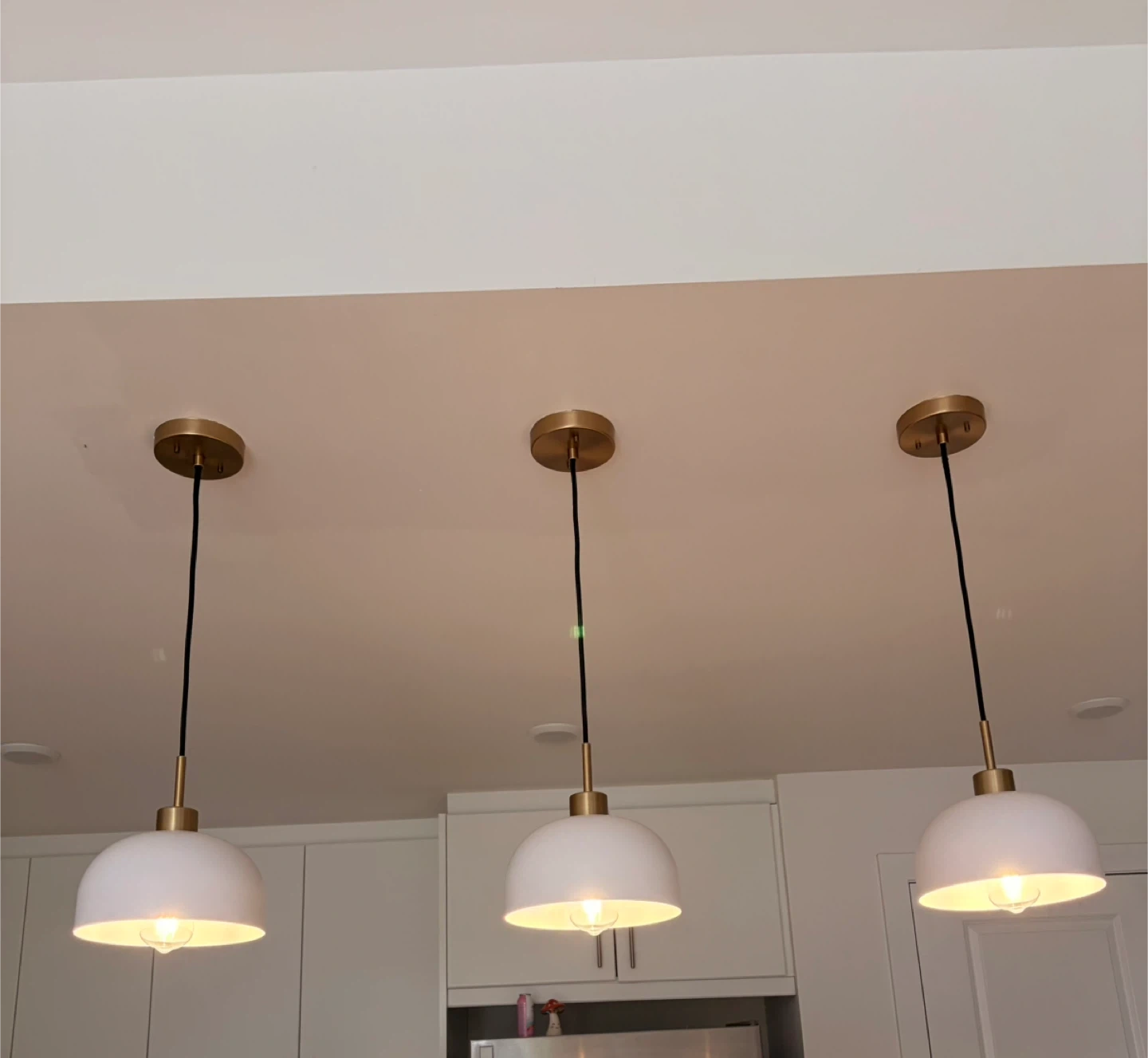 Selling a set of three white dome pendant light fixtures! They feature a sleek, modern design with a white dome shade and gold accents. Perfect for adding a touch of elegance to any room in your home