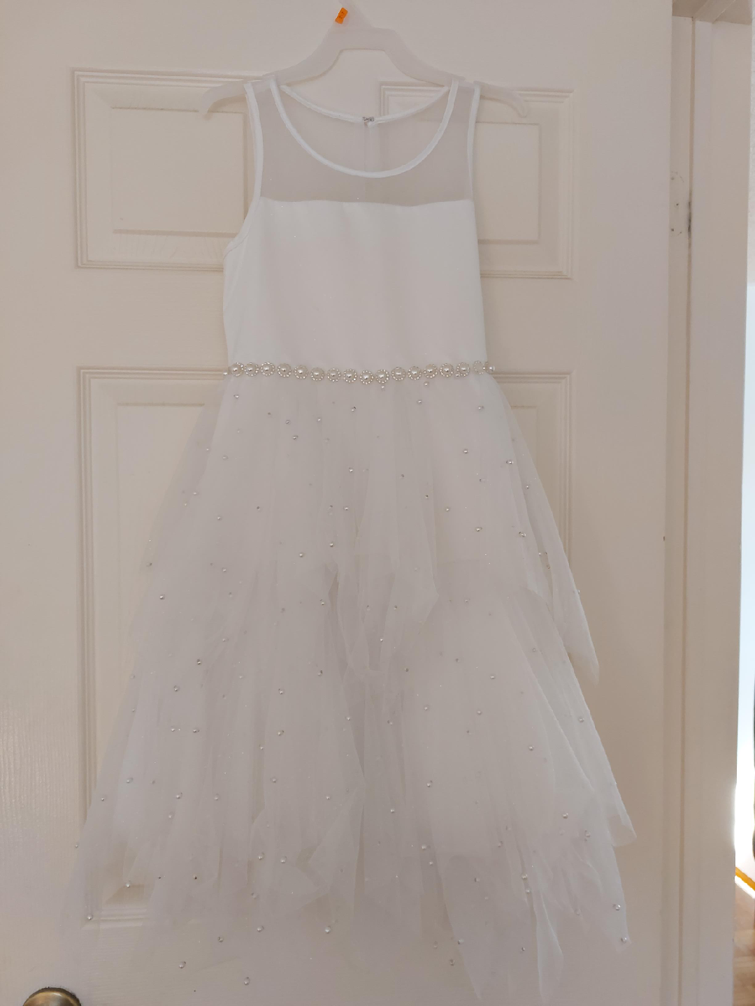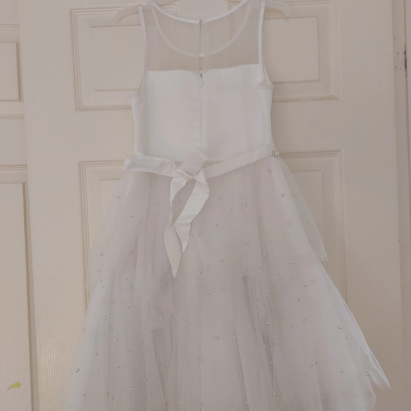 A beautiful white dress, perfect for a special occasion! It features a layered skirt and a delicate beaded belt. It's in great condition and ready for a new home