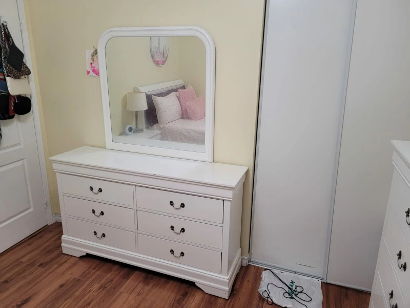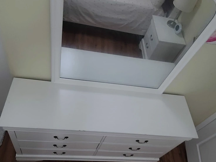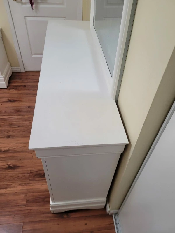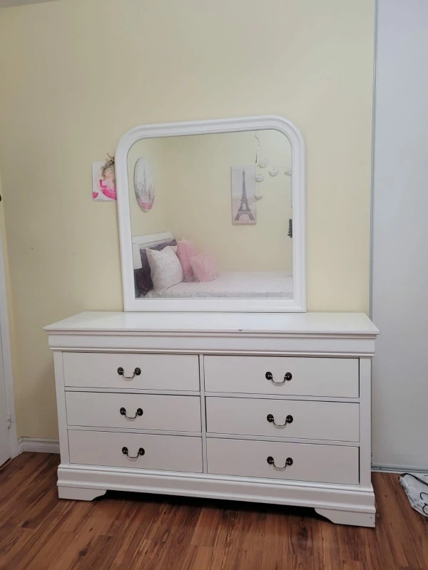 22Six-drawer dresser, white finish. Matching mirror included. Some minor wear.
