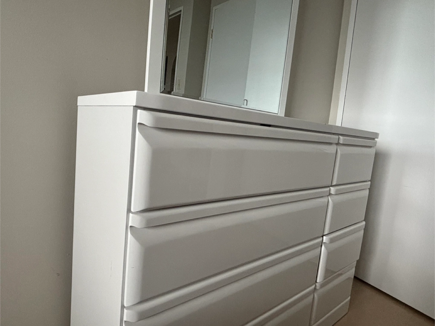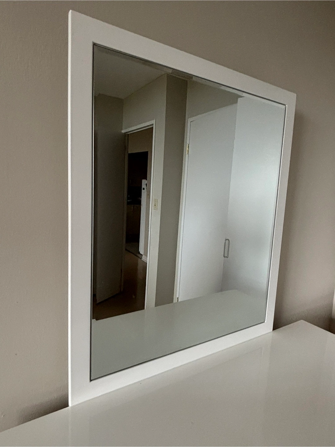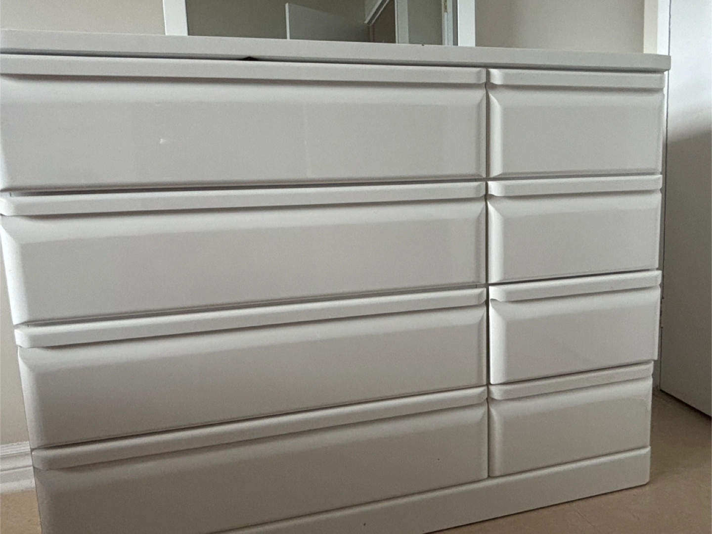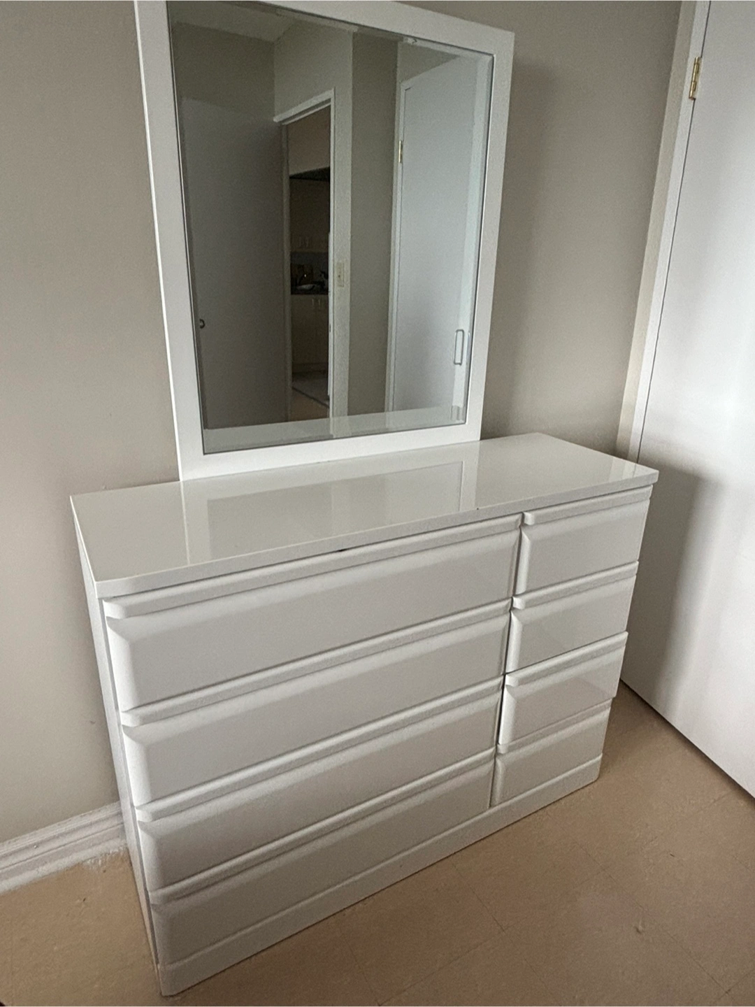 Selling a white dresser with a mirror. It's in great shape and would look lovely in any bedroom. Perfect for adding storage and a touch of elegance to your space. Price can be negotiated.