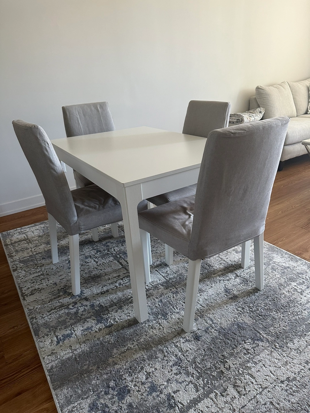 60Small white square dining table that can be extended. Four grey fabric chairs included. Modern style. Good for small spaces. Chair covers are machine washable.