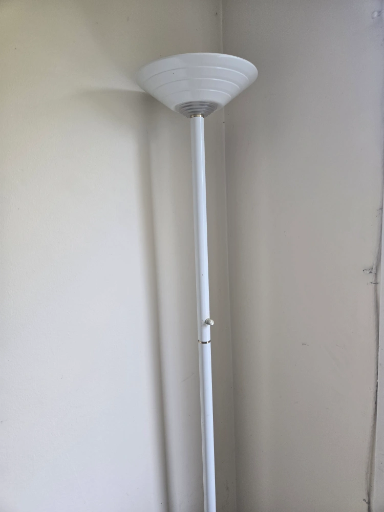 150Selling a white floor lamp. It's in great condition and ready to brighten up your space! It features a classic design with a round shade and a sleek, minimalist pole. Perfect for adding some extra light to any room in your home