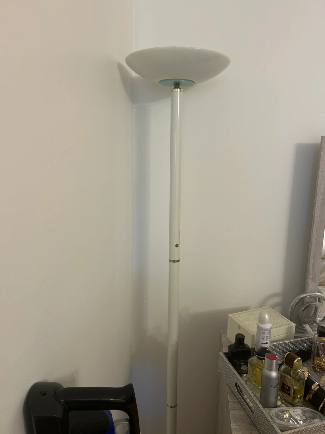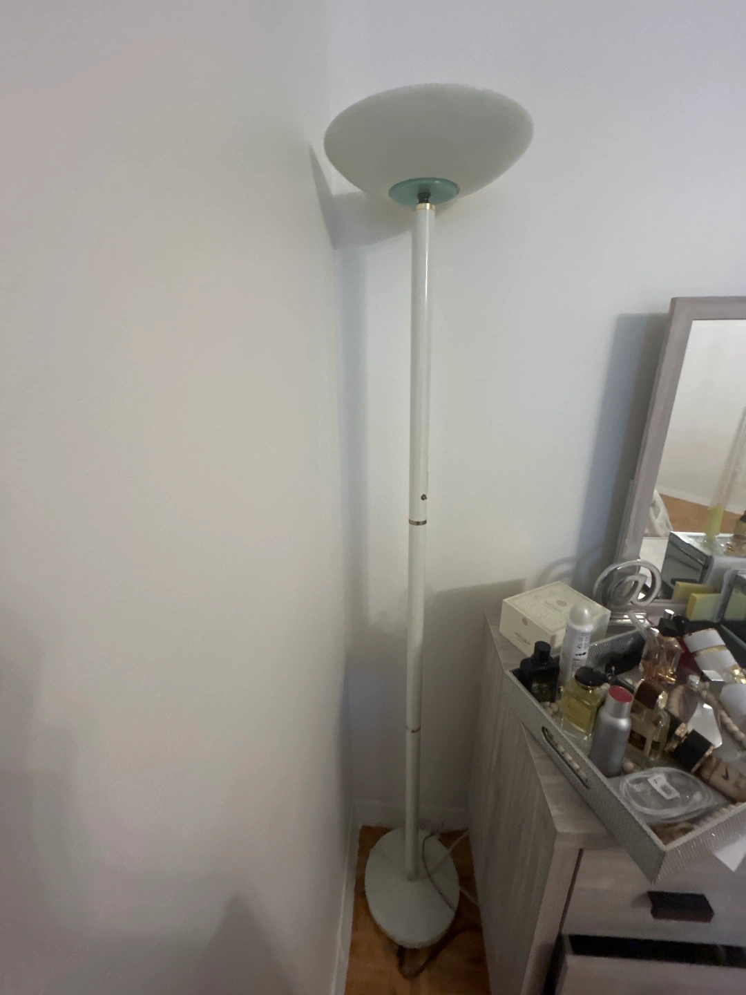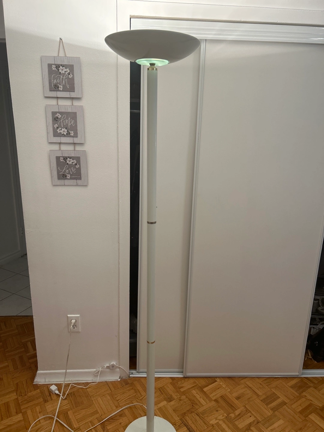 10Tall, slender floor lamp. White finish, frosted glass shade. Simple, minimalist design. Good for reading or ambient lighting.