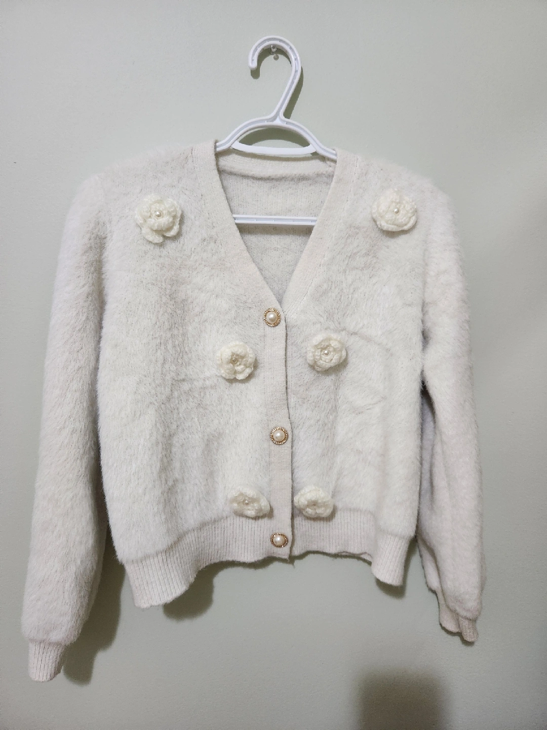 A super cute white cardigan with fluffy texture and floral details! It has pearl-like buttons that add a touch of elegance. Perfect for layering or wearing on its own
