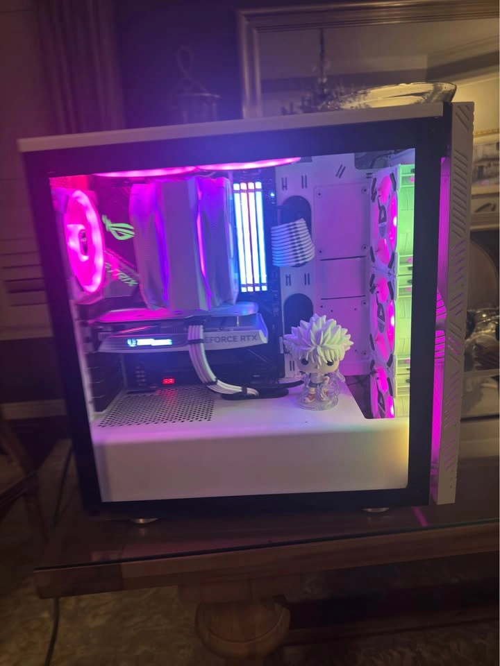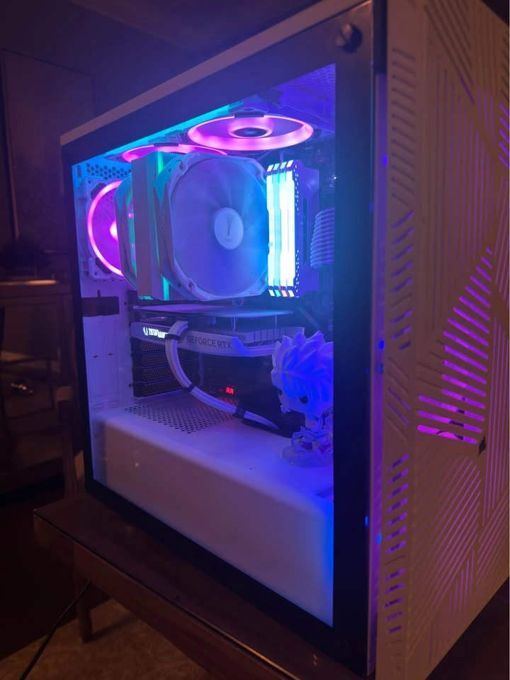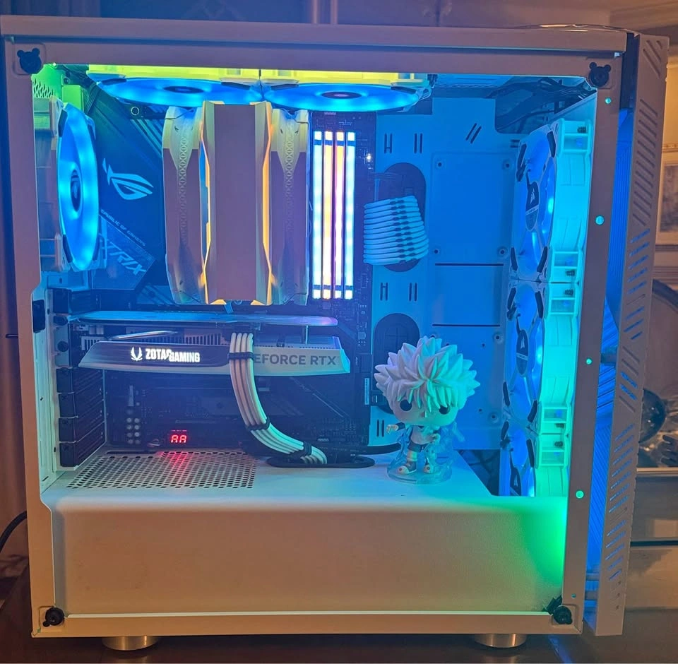 PC Specs: CPU: AMD Ryzen 7 3700X 8-Core/16-Thread RAM: Corsair Vengeance RGB PRO 32Gb (4x8gb), 3200MHz Motherboard: ASUS ROG STRIX X570-E GAMING AMD X570 ATX Hard Drive: Seagate BarraCuda 2TB SATA 3.5'' 7200RPM SSD: WD Black SN750 500GB Graphics Card: Zotac Gaming 4060 white Power Supply: Corsair RMx Series RM650x 80 PLUS Gold Case: Corsair Icu White case, (Not sure the exact model, See photo) Includes: + White RGB Deep Cool High-Performance CPU Cooler + x6 White Corsair LL120 RGB Fans + White Custom cables + Killua Funko Pop GPU and CPU cooler both installed this year. PC has been dusted, reset, and cleaned, with Windows. Let me know if you're interested!