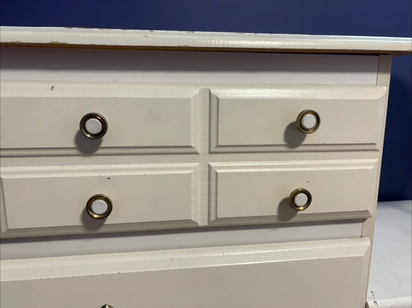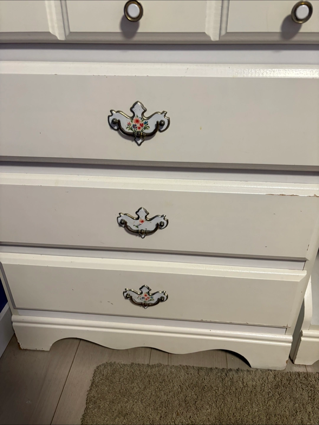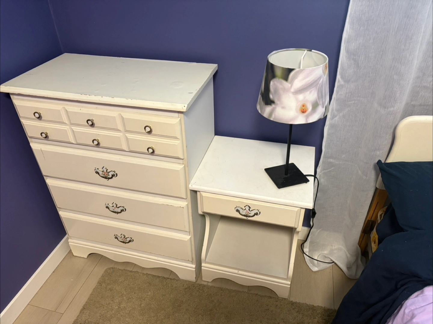 10Selling a cute white dresser, bed and matching nightstand. They're in good used condition and would be perfect for a bedroom set! Top of dresser need a bit of resurfacing. From a wet planter that was on it.