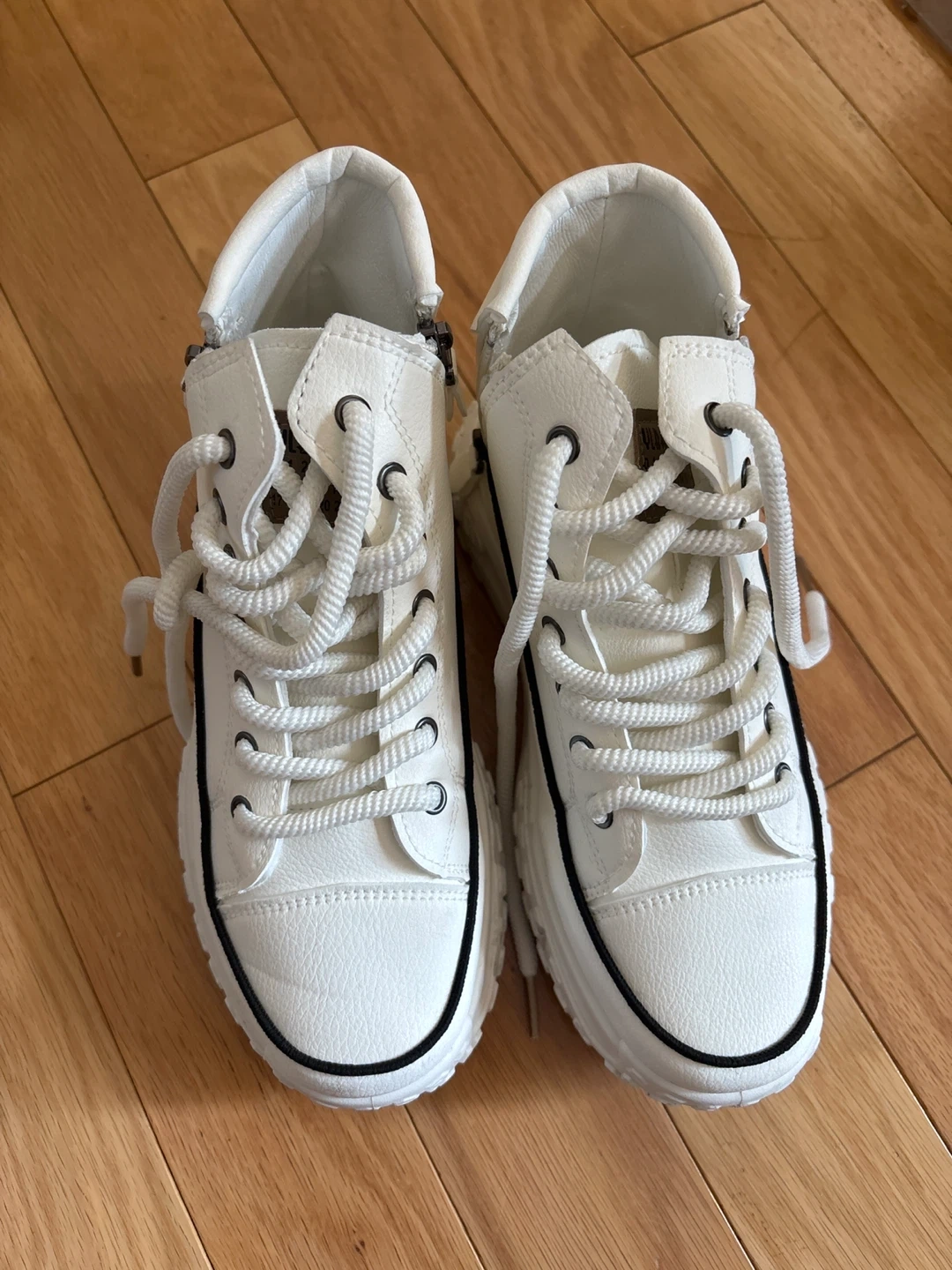 These white high top sneakers are in great shape and ready for a new home! They have a stylish design with laces and zippers on the sides. Perfect for adding a bit of edge to any outfit
