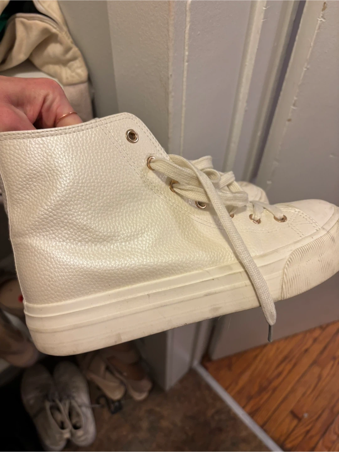 26Selling a pair of white high-top sneakers in size 9. They have a classic look and are perfect for everyday wear. They show some signs of wear, but still have lots of life left!