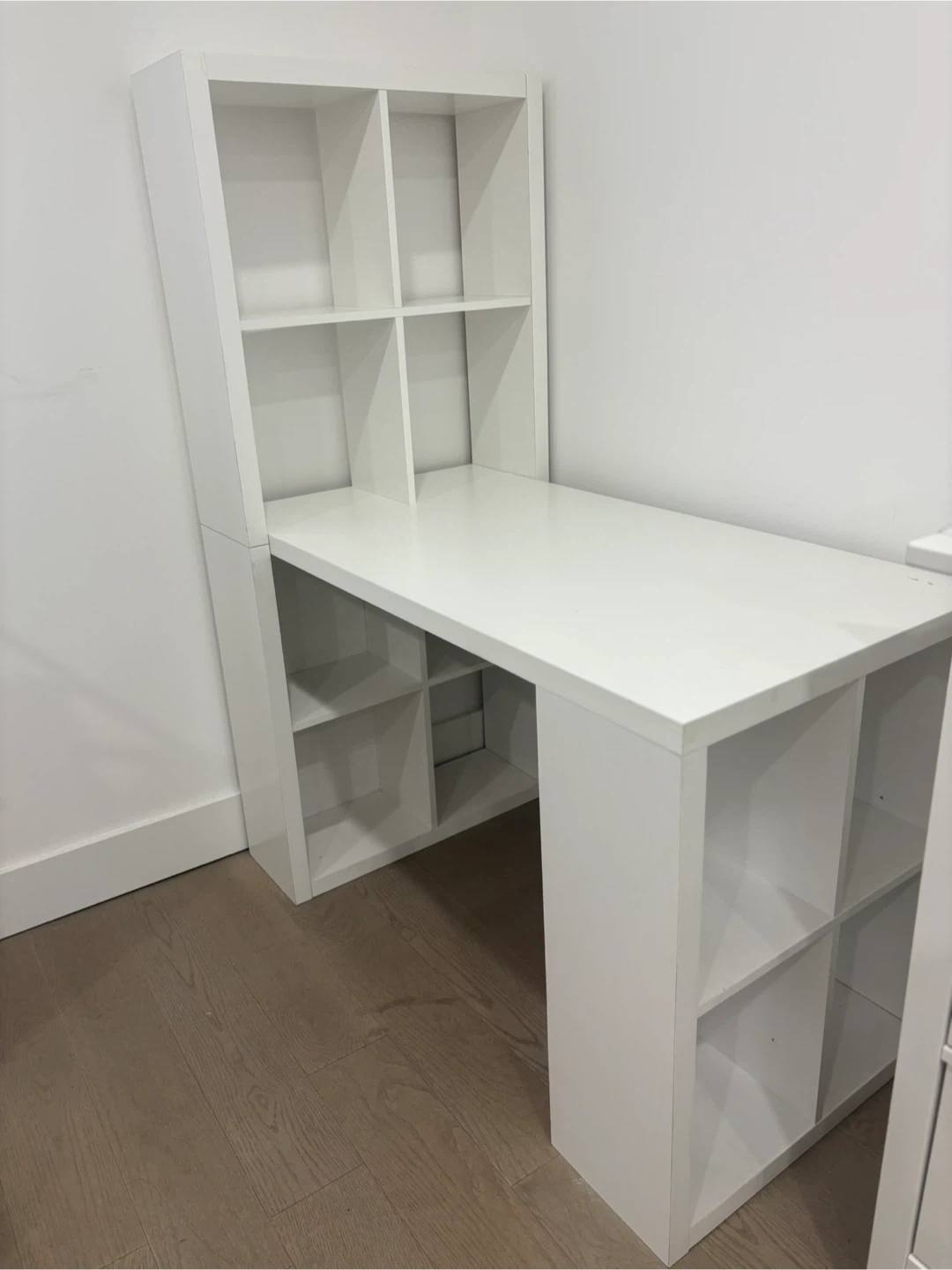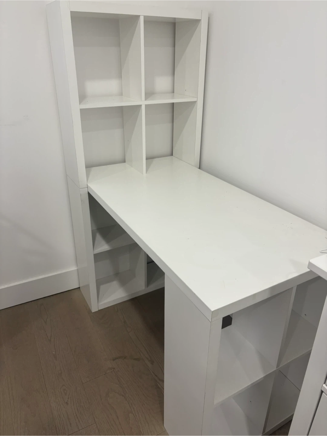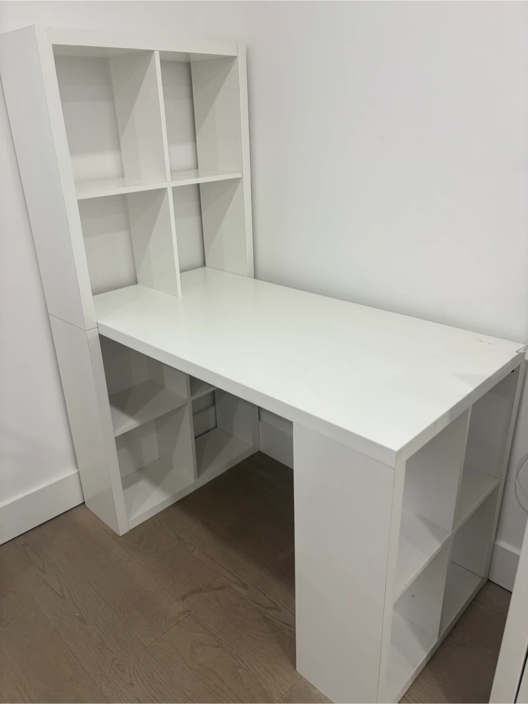 180Selling a white desk with a built-in shelving unit! It's in great condition and perfect for a home office or study space. The shelving provides lots of storage, and the desk is a good size for working or crafting. If you're looking for a functional and stylish desk, this could be it