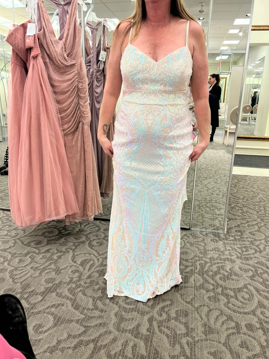 Selling a beautiful opal colour wedding dress size 14 beautiful light weight summer never been worn only for picture never altered