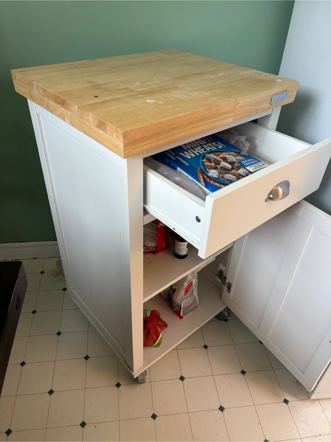 83This kitchen island cart is perfect for adding extra storage and workspace to your kitchen. It features a white base with a wooden countertop, a drawer, and a cabinet for storing your kitchen essentials. It also has wheels so you can easily move it around your kitchen as needed!