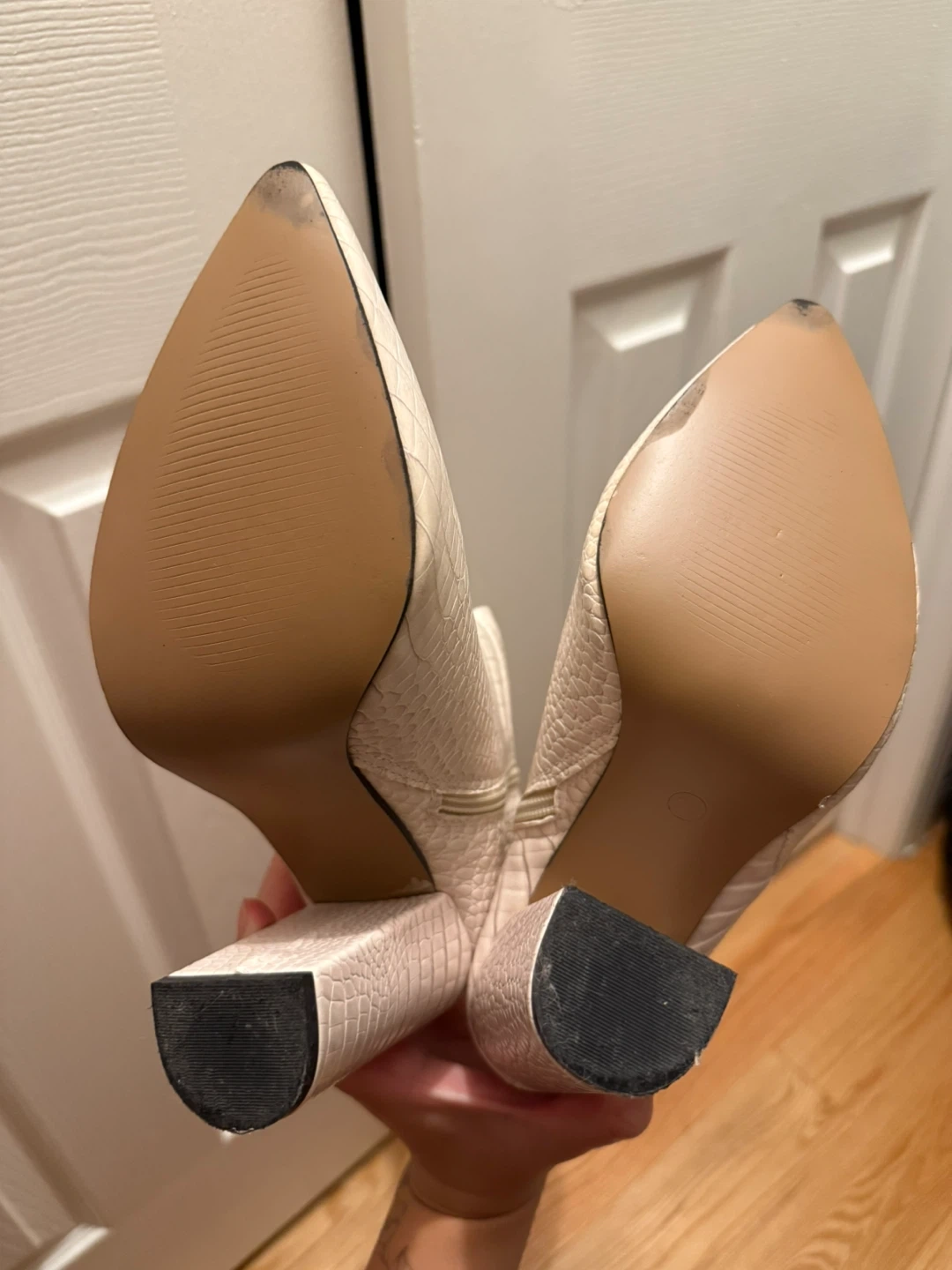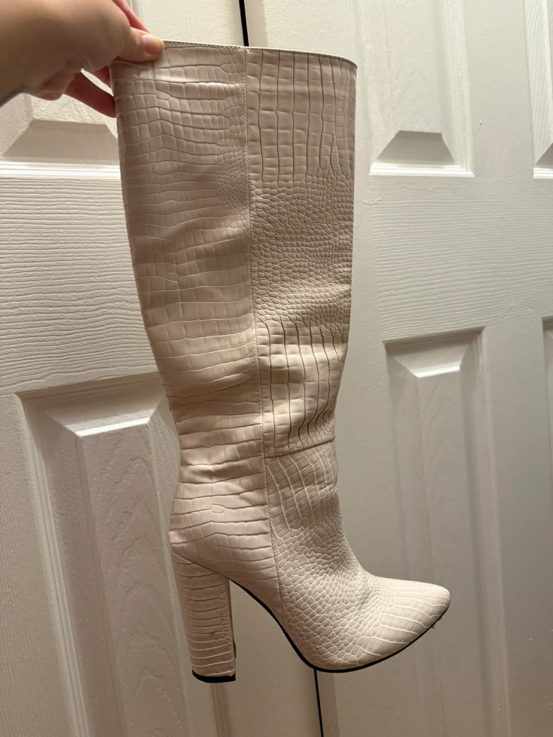 10Chic knee-high vegan leather Paris Texas boot dupes in creamy off-white. Chunky 3” heel is perfect for elevating any outfit. Style with a blazer, under a maxi skirt, with short shorts - your options are endless with this versatile piece. Size 7 US Boot circumference best suits 15” or less. Not wide calf friendly. Only worn twice with sole protection and therefore very little scuffs. Love these boots so much and they have so much life left in them but I don’t fit them anymore. Someone else please love them for me.