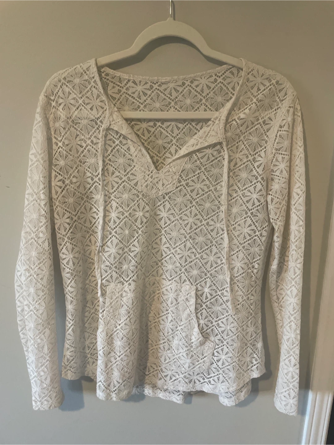 Selling a cute white lace hoodie. It has a v-neck with drawstrings and a front pocket.